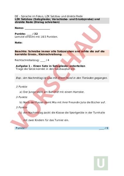 DE – Sprache im Fokus, LZK Satzbau und direkte Rede LZK Satzbau (Satzglieder, Verschiebe- und Ersatzprobe) und direkte Rede (Dialog schreiben) Name: Punkte: 32 Lernziel erreicht mit 18.5 Punkten. Note: Beachte: Schreibe immer alle Satzzeichen und achte die auf die korrekte Gross-, Kleinschreibung. Rechtschreibabzug: 4 Aufgabe 1 – Einen Satz in Satzglieder unterteilen Trage die Sätze korrekt in den Satzbauplan ein. Bsp.: Am Nachmittag ist Lisa mit ihrem Hund in den Tierladen gegangen. 3 Punkte a) Der Junge steht am Bahnhof mit einem Hamster. 3 Punkte b) Nach der Pause räumt Mia mit ihrer Freundin Julia die Bücher auf. 3 Punkte c) Am Nachmittag packt die Klasse die Sportgeräte in der Turnhalle mit zwei Kindern für das Turnier ein. Punkte: 9 Satzbauplan Wer oder was? Verb Mit wem? Wo? Wann? was? Zusatz zum Verb Lisa ist mit ihrem Hund in den Tierladen am Nachmittag -- gegangen Aufgabe 2 – Verschiebeprobe und Ersatzprobe 1. Nimm den Satz b) von vorhin und wende die Verschiebeprobe an. Schreibe 2 mögliche Varianten auf. Bsp.: Mit ihrem Hund ist Lisa am Nachmittag in den Tierladen gegangen. Variante 1: Variante 2: 2. Nimm den Satz b) von vorhin und wende die Ersatzprobe an. Schreibe 2 mögliche Varianten und ersetze jedes Mal mindestens 2 Satzglieder/Dinge. Bsp.: Mit ihrer Katze ist Lisa am Morgen in den Tierladen gegangen. Variante 1: Variante 2: Punkte: 8 Aufgabe 3 – Dialog schreiben mit der direkten Rede Schau dir die beiden Bilder an. Wähle eines aus und schreibe einen Dialog zwischen zwei Personen. Setze alle Satzzeichen der direkten Rede korrekt. Setze alle Satzschlusszeichen korrekt. 2x Begleitsatz vor der direkten Rede. (6 Punkte) 1x Begleitsatz nach der direkten Rede. (3 Punkte) 1x Begleitsatz innerhalb der direkten Rede (4 Punkte) 1x eine Frage einbauen. (2 Punkte) Bild A: Bild B: Ich wähle Bild Punkte: 15