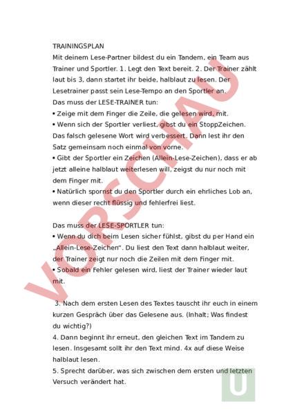TRAININGSPLAN Mit deinem Lese-Partner bildest du ein Tandem, ein Team aus Trainer und Sportler. 1. Legt den Text bereit. 2. Der Trainer zählt laut bis 3, dann startet ihr beide, halblaut zu lesen. Der Lesetrainer passt sein Lese-Tempo an den Sportler an. Das muss der LESE-TRAINER tun: Zeige mit dem Finger die Zeile, die gelesen wird, mit. Wenn sich der Sportler verliest, gibst du ein StoppZeichen. Das falsch gelesene Wort wird verbessert. Dann lest ihr den Satz gemeinsam noch einmal von vorne. Gibt der Sportler ein Zeichen (Allein-Lese-Zeichen), dass er ab jetzt alleine halblaut weiterlesen will, zeigst du nur noch mit dem Finger mit. Natürlich spornst du den Sportler durch ein ehrliches Lob an, wenn dieser recht flüssig und fehlerfrei liest. Das muss der LESE-SPORTLER tun: Wenn du dich beim Lesen sicher fühlst, gibst du per Hand ein „Allein-Lese-Zeichen. Du liest den Text dann halblaut weiter, der Trainer zeigt nur noch die Zeilen mit dem Finger mit. Sobald ein Fehler gelesen wird, liest der Trainer wieder laut mit. 3. Nach dem ersten Lesen des Textes tauscht ihr euch in einem kurzen Gespräch über das Gelesene aus. (Inhalt; Was findest du wichtig?) 4. Dann beginnt ihr erneut, den gleichen Text im Tandem zu lesen. Insgesamt sollt ihr den Text mind. 4x auf diese Weise halblaut lesen. 5. Sprecht darüber, was sich zwischen dem ersten und letzten Versuch verändert hat.