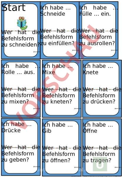 Start Ich habe Schneide Ich habe Fülle ein. Wer hat dieWer hat dieWer hat die Befehlsform Befehlsform Befehlsform zu schneiden? zu einfüllen? zu ausrollen? @texkielerin @texkielerin @texkielerin Ich habe Ich habe Rolle aus. Mixe Ich habe Knete Wer hat die Wer hat die Wer hat die Befehlsform Befehlsform Befehlsform zu mixen? zu kneten? zu drücken? @texkielerin Ich habe Drücke @texkielerin @texkielerin Ich habe Öffne Ich habe Gib Wer hat die Wer hat die Wer hat die Befehlsform Befehlsform Befehlsform zu geben? zu öffnen? zu tragen? @texkielerin @texkielerin @texkielerin Download von eduki.com mit eindeutiger Kennung 26134374. Nur zum Gebrauch im eigenen Unterricht. Weitergabeverboten. Ich habe Ich habe Trage Vermische Ich habe Schließe Wer hat die Wer hat dieWer hat die Befehlsform Befehlsform Befehlsform zu zu schließen? zu erhitzen? vermischen? @texkielerin @texkielerin @texkielerin Ich habe Erhitze Ich habe Ich habe Wasche ab. Schäle Wer hat die Wer hat die Wer hat die Befehlsform Befehlsform Befehlsform zu zu schälen? zu anbraten? abwaschen? @texkielerin @texkielerin @texkielerin Ich habe Brate an. Ich habe Füge hinzu. Ich habe Püriere Wer hat die Wer hat die Wer hat die Befehlsform Befehlsform Befehlsform zu zu zu pürieren? hinzufügen? abschmecken @texkielerin @texkielerin Ich habe Ich habe Schmecke Backe ab. Ich habe Rühre Wer hat dieWer hat die Wer hat die Befehlsform Befehlsform Befehlsform zu rühren? zu schreiben? zu backen? @texkielerin @texkielerin @texkielerin Ich habe Schreibe Ich habe Entferne Ich habe Forme Wer hat die Wer hat die Wer hat die Befehlsform Befehlsform Befehlsform zu entfernen? zu formen? zu umdrehen? @texkielerin @texkielerin @texkielerin Ich habe Ich habe Drehe um. Sammle Ich habe Lies Wer hat die Wer hat die Befehlsform Befehlsform zu sammeln? zu lesen? Ziel @texkielerin @texkielerin @texkielerin Handreichung Anleitung: Jede*rerhälteineKartevomStapel.Allestehe nauf.DiePersonmitderKarteStartbeginntu nsliestden unterenAbschnittlautvor.DiePerson,diedie passendeKartehat,meldetsichundliestdieei geneKartevor.WenndiePersonanderReihew ar,setztsiesich hin. DasSpielendet,wenndas„Zielerreichtwird. Einsatz: DasSpielsolltevorablaminiertwerden. EinsatzbaristesimDeutschunterricht.Geeig netistdasSpielfürdenDeutschunterricht,wen ndasThemaRezeptebehandeltwird. KannalsFreiarbeitsmaterialverwendet werden.VielSpaßbeimSpielen! Download von eduki.com mit eindeutiger Kennung 26134374. Nur zum Gebrauch im eigenen Unterricht. Weitergabeverboten.