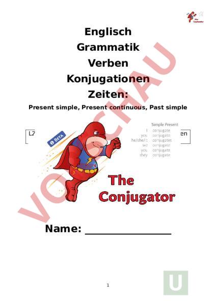 Englisch Grammatik Verben Konjugationen Zeiten: Present simple, Present continuous, Past simple LZ: Ich kann Verben in die Personen und Zeiten setzen konjugieren. Name: 1 Was sind Verben? Verben sind Tuwörter. Sie beschreiben Handlungen, Vorgänge oder Zustände. Beispiele Deutsch: laufen, denken, schlafen, regnen, Beispiele Englisch: to walk, to think, to sleep, to rain, Grundform/Infinitiv Der Infinitiv ist die Grundform eines Verbs – also die Form, die man im Wörterbuch findet. Man erkennt ihn oft an der Endung «-en» oder «-n» im Deutschen. Z. B. gehen, lesen, machen, sein, Im Englisch am Wörtchen «to». Z. B. to go, to read, to make, to be, Beim Konjugieren lässt man das «to» weg. 2 Verben in Personen setzen/konjugieren Ein Verb verändert seine Form, je nach dem wer etwas tut (ich, du, er, sie, es man, wir, ihr, sie, Sie). Das nennt man konjugieren. Das Verb passt sich also der Person an. Beispiel mit gehen auf Deutsch: 1. Person 2. Person 3. Person Singular ich gehe du gehst er/sie/es/man geht Plural wir gehen ihr geht sie/Sie gehen Beispiel mit gehen auf Englisch ( to go): 1. Person 2. Person 3. Person Singular go you go he/she/it goes Plural we go you go they go Verben in Zeiten setzen Ein Verb kann in verschiedene Zeiten gesetzt werden, um zu zeigen, wann etwas passiert. Beispiel mit gehen auf Deutsch in der 1. Person Singular (ich): Gegenwart Vergangenheit Zukunft Präsens Präteritum/Imperfekt Perfekt Plusquamperfekt Futur 1 Futur 2 ich ich ich ich ich ich gehen ging bin gegangen war gegangen werde gehen werde gegangen sein Beispiel mit gehen auf Englisch in der 1. Person Singular (I): Gegenwart Vergangenheit Zukunft Present simple Present continuous Past simple Past continuous Perfect Past perfect will-future going-to-future 3 I I I I go am going went was going have gone had gone will go am going to go Zeitstrahl 4 Unregelmässige Verben Wie im Deutschen gibt es Verben, welche regelmässig und unregelmässig konjugiert werden. Bei den unregelmässigen Verben verändert sich der Stamm. Diese müssen auswendig gelernt werden, weil sie sich nicht an die Regeln der regelmässigen Verben halten. Beispiel Deutsch: regelmässig (-en/-te/ge-t) unregelmässig: machen – machte – gemacht singen – sang gesungen suchen – suchte – gesucht schwimmen – schwamm – geschwommen Beispiel Englisch: regelmässig (to /-ed/-ed) unregelmässig: to play – played -played to do – did – done to talk – talked – talked to swim – swam – swum 5 Liste der unregelmässigen Verben Infinitive past simple past participle 6 German translation Infinitive past simple past participle 7 German translation Present simple Wann benutzt man das Present simple? Dinge, die immer wahr sind (The sun rises. Die Sonne geht auf.) Gewohnheiten/Routinen (I get up at 7am. Ich stehe um 7 Uhr auf.) Fakten (Water boils at 100 degree celsius. Wasser kocht bei 100 Grad Celsius.) Bildung (): Person Hauptverb (in der Grundform) ausser bei he/she/it ein -s muss mit Beispiel: see, he/she/it sees, we see normal -s to make he/she/it makes endet mit-ch, -sh, -ss, -o -es to watch he/she/it watches endet mit Konsonant und -y -y -ies to cry he/she/it cries Bildung (-): Person dont Hauptverb (in der Grundform) ausser bei he/she/it doesnt Verb (in der Grundform) Beispiel: dont see, she doesnt see Bildung (?): Do Person Hauptverb (in der Grundform)? Does Person Verb (in der Grundform)? Beispiel: Do see? Does he see? Bildung (?-) Dont Person Hauptverb (in der Grundform)? Doesnt Person Verb (in der Grundform)? Beispiel: Dont you see? Doesnt he see? 8 endet auf Vokal und -y -s to play he/she/it plays Wichtige Verben: to be (sein) 1. Person Singular am Im you are youre he/she/it is hes/shes/its Plural we are were you are youre they are theyre to have (haben) 1. Person Singular have Ive Plural we have weve 2. Person you have youve he/she/it has you have youve they have theyve Singular will Ill you will youll he/she/it will hell/shell/itll Plural we will well you will youll they will theyll 2. Person 3. Person 3. Person to will (werden) 1. Person 2. Person 3. Person 9 Übungen: Konjugiere im Present simple. to eat Singular Plural Singular Plural Singular Plural Singular Plural Singular Plural Singular Plural 1. Person 2. Person 3. Person to see 1. Person 2. Person 3. Person to watch 1. Person 2. Person 3. Person to look 1. Person 2. Person 3. Person to cry 1. Person 2. Person 3. Person to catch 10 1. Person 2. Person 3. Person to talk Singular Plural Singular Plural Singular Plural Singular Plural Singular Plural 1. Person 2. Person 3. Person to fly 1. Person 2. Person 3. Person to 1. Person 2. Person 3. Person to 1. Person 2. Person 3. Person to 1. Person 2. Person 3. Person 11 to 1. Person Singular Plural Singular Plural Singular Plural Singular Plural Singular Plural Singular Plural 2. Person 3. Person to 1. Person 2. Person 3. Person to 1. Person 2. Person 3. Person to 1. Person 2. Person 3. Person to 1. Person 2. Person 3. Person to 1. Person 2. Person 12 3. Person to 1. Person Singular Plural Singular Plural Singular Plural Singular Plural 2. Person 3. Person to 1. Person 2. Person 3. Person to 1. Person 2. Person 3. Person to 1. Person 2. Person 3. Person 13 Present continuous Wann benutzt man das Present continuous? Handlungen, die gerade jetzt passieren (I am reading book. Ich lese gerade jetzt ein Buch.) Vorübergehende Handlungen/Zustände (She is living with her aunt this month. Sie lebt diesen Monat mit ihrer Tante.) geplante zukünftige Handlungen (We are meeting Tom tomorrow. Wir treffen Tom morgen.) Handlungen, die sich entwicklen/verändern (The weather is getting colder. Das Wetter wird kälter.) Bildung (): Person am/is/are (to be konjugiert im Präsens als Hilfsverb) Hauptverb -ing Beispiel: am looking hes looking, were looking normal endet mit -e -ing -e weg, -ing hinzufügen to make she is making to sing am singing endet mit kurzem Konsonant Konsonant verdoppeln -ing to sit we are sitting endet