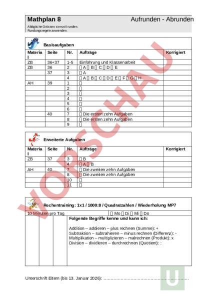 Mathplan 8 Aufrunden Abrunden Alltägliche Grössen sinnvoll runden. Rundungsregeln anwenden. Basisaufgaben Materia ZB ZB Seite Nr. Aufträge 3637 36 37 AH 39 1-5 2 3 4 1 2 3 4 5 6 7 8 9 Einführung und Klassenarbeit ABCDE A ABCDEFGH Die ersten zehn Aufgaben Die ersten zehn Aufgaben 40 Korrigiert Erweiterte Aufgaben Materia ZB Seite Nr. Aufträge 37 AH 40 3 4 7 8 10 11 B AB Die zweiten zehn Aufgaben Die zweiten zehn Aufgaben Korrigiert Rechentraining: 1x1 1000:8 Quadratzahlen Wiederholung MP7 10 Minuten pro Tag Mo Di Mi Do Folgende Begriffe kenne und kann ich: Addition – addieren – plus rechnen (Summe): Subtraktion – subtrahieren – minus rechnen (Differenz): Multiplikation – multiplizieren – malrechnen (Produkt): Division – dividieren – durchrechnen (Quotient): Unterschrift Eltern (bis 13. Januar 2026):