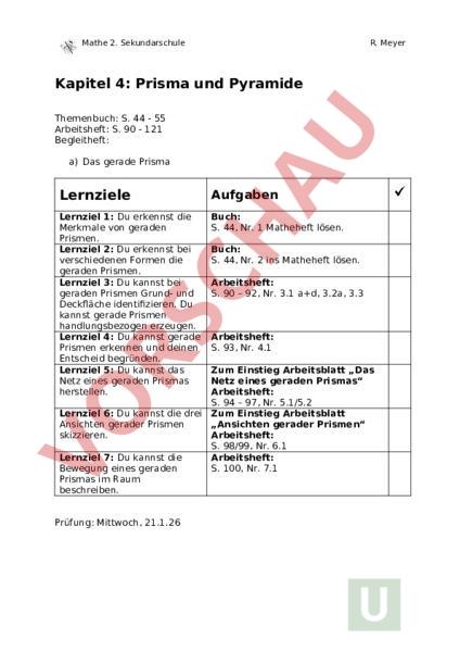 Mathe 2. Sekundarschule R. Meyer Kapitel 4: Prisma und Pyramide Themenbuch: S. 44 55 Arbeitsheft: S. 90 121 Begleitheft: a) Das gerade Prisma Lernziele Aufgaben Lernziel 1: Du erkennst die Merkmale von geraden Prismen. Lernziel 2: Du erkennst bei verschiedenen Formen die geraden Prismen. Lernziel 3: Du kannst bei geraden Prismen Grund- und Deckfläche identifizieren. Du kannst gerade Prismen handlungsbezogen erzeugen. Lernziel 4: Du kannst gerade Prismen erkennen und deinen Entscheid begründen. Lernziel 5: Du kannst das Netz eines geraden Prismas herstellen. Buch: S. 44, Nr. 1 Matheheft lösen. Buch: S. 44, Nr. 2 ins Matheheft lösen. Arbeitsheft: S. 90 – 92, Nr. 3.1 ad, 3.2a, 3.3 Arbeitsheft: S. 93, Nr. 4.1 Zum Einstieg Arbeitsblatt „Das Netz eines geraden Prismas Arbeitsheft: S. 94 – 97, Nr. 5.1/5.2 Lernziel 6: Du kannst die drei Zum Einstieg Arbeitsblatt Ansichten gerader Prismen „Ansichten gerader Prismen skizzieren. Arbeitsheft: S. 98/99, Nr. 6.1 Lernziel 7: Du kannst die Arbeitsheft: Bewegung eines geraden S. 100, Nr. 7.1 Prismas im Raum beschreiben. Prüfung: Mittwoch, 21.1.26