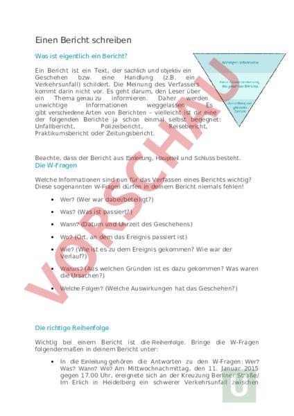 Einen Bericht schreiben Was ist eigentlich ein Bericht? Ein Bericht ist ein Text, der sachlich und objektiv ein Geschehen bzw. eine Handlung (z.B. ein Verkehrsunfall) schildert. Die Meinung des Verfassers kommt darin nicht vor. Es geht darum, den Leser über ein Thema genau zu informieren. Daher werden unwichtige Informationen weggelassen. Es gibt verschiedene Arten von Berichten – vielleicht ist dir eine der folgenden Berichte ja schon einmal selbst begegnet: Unfallbericht, Polizeibericht, Reisebericht, Praktikumsbericht oder Zeitungsbericht. Beachte, dass der Bericht aus Einleitung, Hauptteil und Schluss besteht. Die W-Fragen Welche Informationen sind nun für das Verfassen eines Berichts wichtig? Diese sogenannten W-Fragen dürfen in deinem Bericht niemals fehlen! Wer? (Wer war dabei/beteiligt?) Was? (Was ist passiert?) Wann? (Datum und Uhrzeit des Geschehens) Wo? (Ort, an dem das Ereignis passiert ist) Wie? (Wie ist es zu dem Ereignis gekommen? Wie war der Verlauf?) Warum? (Aus welchen Gründen ist es dazu gekommen? Was waren die Ursachen?) Welche Folgen? (Welche Auswirkungen hat das Geschehen?) Die richtige Reihenfolge Wichtig bei einem Bericht ist die Reihenfolge. Bringe die W-Fragen folgendermaßen in deinem Bericht unter: In die Einleitung gehören die Antworten zu den W-Fragen: Wer? Was? Wann? Wo? Am Mittwochnachmittag, den 11. Januar 2015 gegen 17.00 Uhr, ereignete sich an der Kreuzung Berliner Straße/ Im Erlich in Heidelberg ein schwerer Verkehrsunfall zwischen einem 26-jährigen Motorradfahrer und einer 18 Jahre alten Autofahrerin. In den Hauptteil schreibst du die Antworten zu den W-Fragen: Was? Wie? Warum? Ersten Angaben zufolge soll die junge Frau den Motoradfahrer übersehen und ihm die Vorfahrt genommen haben. Dabei kam es zu dem Zusammenstoß. Augenzeugen informierten die Polizei und den Rettungsdienst. Im Schluss gehst du auf folgende W-Frage ein: Welche Folgen? Beide Fahrer wurden schwerverletzt ins örtliche Krankenhaus gebracht. Ihr Zustand ist weiterhin kritisch. Der Sachschaden beläuft sich auf rund 15.000 Euro. Die Sprache des Berichts Die Sprache des Berichts ist immer sachlich und klar. Es geht bei einem Bericht nicht (wie etwa bei einer Erzählung) darum, Spannung zu erzeugen. Merke dir also, dass bei einem Bericht der Leser sachlich über ein Geschehen oder eine Handlung informiert wird. Richtig: Am Mittwochnachmittag, den 11. Januar 2015 gegen 17.00 Uhr, ereignete sich an der Kreuzung Berliner Straße/ Im Erlich in Heidelberg ein schwerer Verkehrsunfall zwischen einem 26-jährigen Motorradfahrer und einer 18 Jahre alten Autofahrerin. Ersten Angaben zufolge soll die junge Frau den Motoradfahrer übersehen und ihm die Vorfahrt genommen haben. Dabei kam es zu dem Zusammenstoß. Augenzeugen leisteten Erste Hilfe und informierten die Polizei und den Rettungsdienst. Beide Fahrer wurden schwerverletzt ins örtliche Krankenhaus gebracht. Ihr Zustand ist weiterhin kritisch. Warum die Frau den Motoradfahrer übersehen hat, ist bislang noch nicht geklärt. Der Sachschaden beläuft sich auf rund 15.000 Euro. Umgangssprache, wörtliche Rede, Vermutungen und deine eigene Meinunghaben in einem Bericht nichts zu suchen. Vermeide diese daher! Schreibe also nicht: Am Mittwoch, irgendwann nachmittags, ereignete sich an einer Kreuzung in Heidelberg ein übelst brutaler Verkehrsunfall, bei dem vermutlich eine arme Fahranfängerin einem coolen Biker die Vorfahrt genommen hat. „Die junge Frau hat den Motorradfahrer übersehen und ihm die Vorfahrt genommen, teilte Polizeichef Peter Birch mit. Zum Glück leisteten Augenzeugen sofort erste Hilfe und informierten Polizei und Rettungsdienst. Ich bin froh, nicht vor Ort gewesen zu sein, da ich kein Blut sehen kann. Die junge Fahrerin und der Motoradfahrer wurden schnell ins Krankenhaus gebracht. Der Sachschaden beträgt – haltet euch fest! – stolze 15.000 Euro. Krass, oder? Die verwendete Zeitform bei einem Bericht ist das Präteritum. Es wird ja von etwas berichtet, das bereits geschehen und daher schon Vergangenheit ist.