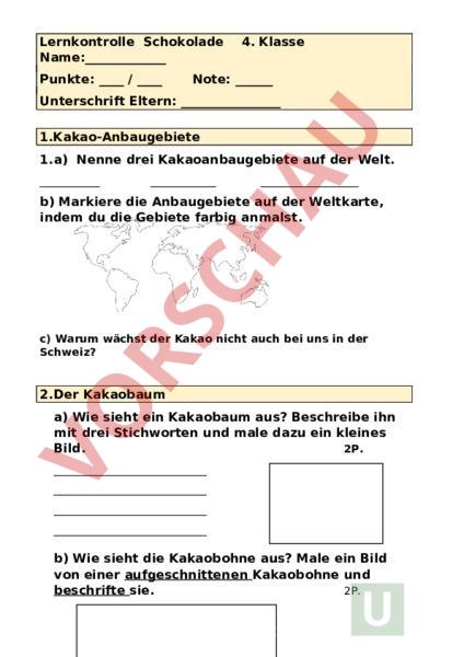 Lernkontrolle Schokolade Name:_ Punkte: 4. Klasse Note: Unterschrift Eltern: 1.Kakao-Anbaugebiete 1.a) Nenne drei Kakaoanbaugebiete auf der Welt. b) Markiere die Anbaugebiete auf der Weltkarte, indem du die Gebiete farbig anmalst. c) Warum wächst der Kakao nicht auch bei uns in der Schweiz? 2.Der Kakaobaum a) Wie sieht ein Kakaobaum aus? Beschreibe ihn mit drei Stichworten und male dazu ein kleines Bild. 2P. b) Wie sieht die Kakaobohne aus? Male ein Bild von einer aufgeschnittenen Kakaobohne und beschrifte sie. 2P. 3.Was passiert der Reihe nach in der Kakaoverarbeitung? Bringe die Bilder in die richtige Reihenfolge und verbinde mit dem passenden Text. Die länglichen Früchte sehen lila, rot braun oder gelb aus. Sie werden mit dem Messer geöffnet und das Fruchtfleisch mit den Kakaobohnen herausgeholt. Kakao wächst zum grössten Teil auf kleineren Feldern unter dem Schatten grösserer Bäume. Die Kakaofrüchte werden vorsichtig mit einer Machete vom Baum abgetrennt. Jetzt legt man die Bohnen zum Trocknen auf Bananenblätter und deckt sie auch damit zu. Diesen Vorgang nennt man auch Fermentation. Dadurch erhält der Kakao seinen besonderen Geschmack und eine gute Qualität. Nachdem die Kakaobohnen verkauft wurden, werden die Säcke in riesige Containerschiffe verladen. Diese transportieren den Kakao zur Weiterverarbeitung z.B. in die Schweiz. Anschliessend werden die Bohnen nochmals 2-3 Tage an der Sonne getrocknet. Nach dem Trocknen werden die Bohnen in Transportsäcke gefüllt und gelagert. 5P. 4. Die Geschichte des Kakaos a) Wer brachte den Kakao aus Amerika nach Europa? 1P. b) Warum nannte man Kakao das „schnelle Geld? 1P. c) Was ist Xcolatl? 1P. d) Wie wurde das für edle gehaltene Kakaogetränk schmackhafter gemacht? 1P. 5. Auf der Kakaoplantage a) Beschreibe das Leben der Kinder auf den Kakaoplantagen in drei Sätzen: 2P. b) Was kannst du dagegen tun, damit es den Familien auf den Plantagen bessergeht und sie mehr Geld verdienen? 1P. 6. Fairtrade a) Was verstehst du unter „Fairtrade? 2P. b) Warum sind die Fairtrade Produkte meist teurer als die Produkte, die das Label (Zeichen) nicht haben? 2P. c) Nenne drei weitere Produkte (NICHT Kakao), welche auch ein Fairtrade Label habe können. 1.5 P. 7. Die Schokoladenfabrik a) Nummeriere die Verarbeitung der Schokolade in der richtigen Reihenfolge. (Schreibe die Nummer ins Bildkästchen hinein. b) Formuliere zu jedem Verarbeitungsschritt 1-2 Sätze. 6P. 1) 2) 3)_ 4) 5)_ 6)_ 8. Schokoladenprofi a) Welche Schokolade weist den grössten Kakaoanteil auf? (Die schwarze, braune oder weisse Schokolade?) 0.5P. b)Warum ist das so? 1 P. c) Welche Zutaten hat die weisse Schokolade oder auch nicht, welche die schwarze Schokolade hat oder eben nicht hat? 1P. Und zum Schluss wenn du noch Zeit hast: Notiere oder male deine Lieblingsschoggi (Gibt jedoch keine Punkte