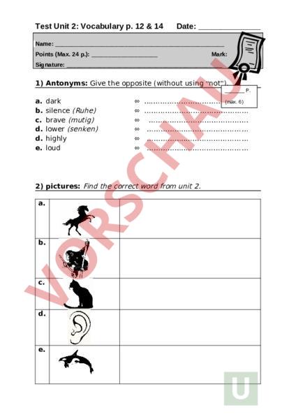 Test Unit 2: Vocabulary p. 12 14 Date: Name: Points (Max. 24 p.): Mark: Signature: 1) Antonyms: Give the opposite (without using not). P. a. b. c. d. d. e. dark silence (Ruhe) brave (mutig) lower (senken) highly loud (max. 6) . . 2) pictures: Find the correct word from unit 2. a. b. c. d. e. f. P. (max. 6 3) Word family: Transform these words. a. noun: chemistry . b. noun: excitement c. adj.: dangerous d. verb: sign d. noun: anger adjective: adjective: noun: . noun: adjective: P. (max. 5 4) Gaps: Find the correct word from unit 2. a. Our neighbours dog is very, he always tries to bite me! b. My cousin often his little sister, because she is only 2 years old and cant stay alone. c. My favourite (pl.!) are dogs, dolphins and lions. d. We humans not only with our voice, but also with our body. e. Red roses are of love. f. After 12 hours of sleep feel completely . g. Your eyes and your mouth are part of your. So you use it to express something with your face. P. (max. 7)