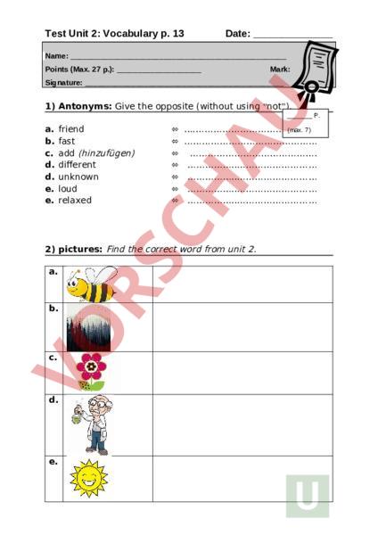 Test Unit 2: Vocabulary p. 13 Date: Name: Points (Max. 27 p.): Mark: Signature: 1) Antonyms: Give the opposite (without using not). P. a. b. c. d. d. e. e. friend fast add (hinzufügen) different unknown loud relaxed (max. 7) . . 2) pictures: Find the correct word from unit 2. a. b. c. d. e. P. (max. 5) 3) Word family: Transform these words. a. verb: block . b. verb: react c. adj.: normal d. verb: suit adjective: noun: adverb: . adjective: P. (max. 4) 4) Synonym: Find word with the same meaning. a. b. c. d. hit feeling fast keep . . P. (max. 4) 5) Gaps: Find the correct word from unit 2. a. Lets in the park, the sun is shining and its warm outside. b. From 2010 to 2020 was very exciting for me! c. love to play (pl.). Monopoly and Eile mit Weile are my favourite ones. d. If the sun is shining you should put sun-cream to protect your. e. can the pigs from here. They are bit stinky. f. Did you the solution of the riddle (Rätsel)? g. She can speak all languages from Switzerland Rätoromanisch. But this is very rare language, though. P. (max. 7)