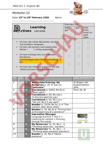 NW4 Unit 3 Englisch 8th Workplan 10 Date: 23st to 26th February 2026 Name: Learning objectives Lernziele NO Das kann ich sehr gut. gut. noch nicht, muss ich noch üben. Ich kann den neuen Wortschatz mündlich und schriftlich anwenden. Ich kann die ing-form nach bestimmten Verben ) richtig anwenden. Ich kann wichtige Infos aus Hörtexten entnehmen. (Lernstrategien beim Hören: Coursebook, p. 62) Ich kann das «Personal pronoun» und das «Object pronoun» richtig anwenden. DON A/E TASK MORE INFORMATION 1 2 Zu Beginn der Englischlektion üben. Track 44, 45 3 4 5 6 7 8 9 10 Wortschatz-Training: My Resources p. 24, 4th part to welcome Coursebook p. 62/63, No 9a-d Team sport Coursebook p. 64, No 10a-c Is this the sport for you Coursebook p. 65, No 11a-c You can do it if you want Booster p. 23/24, No 2a, b, Theing form after other verbs Booster p. 24, No 3a-d The-ing form at the beginning of sentence Interaktive Übungen Language practice Unit 3 Listening for content Running through the woods My Resources p. 35, No 1 5 Thinking about the – ing form My Resources p. 35, No 1 3 Thinking about personal pronouns Booster p. 25, No 4 Object pronouns NW4 Unit 3 Englisch 8th 11 12 Worksheet 1 Personal pronouns Object Pronouns Worksheet Personal pronouns: subject form object form