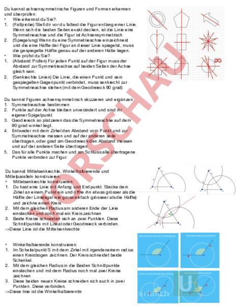 Du kannst achsensymmetrische Figuren und Formen erkennen und überprüfen: • Wie erkennst du Sie?: 1. (Faltprobe) Stell dir vor du faltest die Figur entlang einer Linie. Wenn sich die beiden Seiten exakt decken, ist die Linie eine Symmetrieachse und die Figur ist Achsensymmetrisch 2. (Spiegelung) Wenn du eine Symmetrieachse einzeichnest und die eine Hälfte der Figur an dieser Linie spiegelst, muss die gespiegelte Hälfte genau auf der anderen Hälte liegen. • Wie prüfst du Sie? 1. (Abstand Prüfen) Für jeden Punkt auf der Figur muss der Abstand zur Symmetrieachse auf beiden Seiten der Achse gleich sein. 2. (Senkrechte Linien) Die Linie, die einen Punkt und sein gespiegelten Gegenpunkt verbindet, muss senkrecht zur Symmetrieachse stehen (mit dem Geodreieck 90 grad) Du kannst Figuren achsensymmetrisch skizzieren und ergänzen: 1. Symmetrieachse bestimmen 2. Punkte auf der Achse bleiben unverändert und sind ihr eigener Spigelpunkt 3. Geodreieck so platzieren das die Symmetrieachse auf dem 90 grad winkel liegt. 4. Entweder mit dem Zirkel den Abstand vom Punkt und zur Symmetrieachse messen und auf der anderen seite übertragen, oder grad am Geodreieck den Abstand messen und auf der anderen Seite übertragen 5. Das für alle Punkte machen und am Schluss alle übertragene Punkte verbinden zur Figur. Du kannst Mittelsenkrechte, Winkelhalbierende und Mittelparalleln konstruieren: • Mittelsenkrechte konstruieren: 1. Du hast eine Linie mit Anfang und Endpunkt. Stecke dein Zirkel an einem Punkt ein und öffne ihn etwas grösser als die Hälfte der Linie(egal wie gross einfach grösseer als die Hälfte) und zeichne einen Kreis 2. Mit dem gleichen Radius am anderen Ende der Linie einstecken und noch mal ein Kreis zeichnen 3. Beide Kreise schneiden sich an zwei Punkten. Diese Schnittpunkte mit Lineal oder Geodreieck verbinden. -Diese Linie ist die Mittelsenkrechte • Winkelhalbierende konstruieren: 1. Im Scheitelpunkt mit dem Zirkel mit irgendeneinem radius einen Kreisbogen zeichnen. Der Kreis schneidet beide Schenkel. 2. Mit dem gleichen Radius in die Beiden Schnittpunkte einstechen und mit dem Radius noch mal zwei Kreise zeichnen 3. Diese beiden neuen Kreise schneiden sich auch in zwei Punkten. Diese verbinden. -Diese linie ist die Winkelhalbierende • Mittelparallele konstruieren: 1. Ein Punkt auf einer Linie Wählen, Zirkel einstecken, Radius so wählen das es die parallele Linie schneidet. 2. Mit dem gleichem Radius in beide Schnittpunkte einstechen und wie auf dem Bild rechts einen Schnittpunkt konstruieren. 3. Diesen Schnittpunkt mit dem vom Anfang gewählten Punkt verbinden und eine Linie ziehen. 4. Nun hast du eine Linie mit Anfang und Endpunkt auf den Parallelen linien. 5. nun muss du nur noch eine Mittelsenkrechte von dieser Linie Kontruieren und das ist deine Mittelparallel • 1. 2. 3. 4. 5. Du kannst Punkte oder Figuren an der Spiegelachse spiegeln (mit dem Zirkel): Zwei Punkte auf der Spiegelachse wählen, sodass alle zu spiegelnden Punkte zwischen diesen beiden Punkten liegen Zirkel zuerst in einem Punkt einstecken auf der Spiegelachse Radius von einem Punkt der Figur wählen und auf der anderen Seite der Spiegelachse übertragen. (das mit allen Punkten der Figur machen) Nun den Zirkel wegnehmen und in dem anderen Punkt auf der Spiegelachse einstechen, und nochmals alle Punkte übertargen. Nun sind Schnittpunkte entstanden, diese musst du zu der Figur verbinden. • Du kannst die Spiegelachse erkennen und konstruieren. Du kannst Bild- und/oder Orginalfigur ergänzen. Spiegelachse konstruieren: 1. Du hast einen Punkt und den gespiegelten Punkt A. Nun wendest du die Miitelsenkrechte Methode an. Das heisst du zeichnest zwei Kreise mit dem gleichen Radius (der radius muss grösser als die Hälfte der verbindungslinie zwischen und Asein). Die zwei Schnittpunkte die entstehen musst du Verbinden und diese Linie ist deine Spiegelachse. Bild-/Orginalfigur ergänzen: 1. gleich wie bei punkte spiegeln