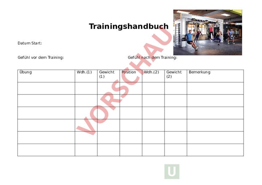 Trainingshandbuch Datum Start: Gefühl vor dem Training: Übung Gefühl nach dem Training: Wdh.(1) Gewicht (1) Position Wdh.(2) Gewicht (2) Bemerkung