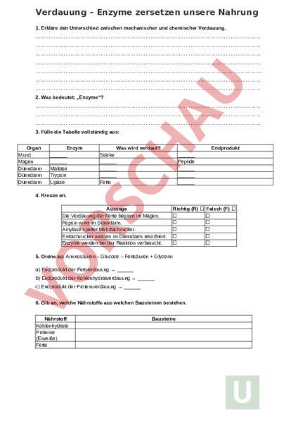 Arbeitsblatt: Verdauung – Enzyme zersetzen unsere Nahrung