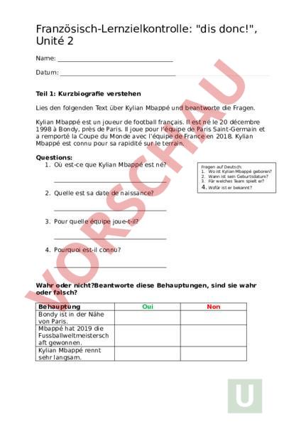 Französisch-Lernzielkontrolle: dis donc!, Unité 2 Name: Datum: Teil 1: Kurzbiografie verstehen Lies den folgenden Text über Kylian Mbappé und beantworte die Fragen. Kylian Mbappé est un joueur de football français. Il est né le 20 décembre 1998 à Bondy, près de Paris. Il joue pour léquipe de Paris Saint-Germain et remporté la Coupe du Monde avec léquipe de France en 2018. Kylian Mbappé est connu pour sa rapidité sur le terrain. Questions: 1. Où est-ce que Kylian Mbappé est né? 2. Quelle est sa date de naissance? Fragen auf Deutsch: 1. Wo ist Kylian Mbappé geboren? 2. Wann ist sein Geburtsdatum? 3. Für welches Team spielt er? 4. Wofür ist er bekannt? 3. Pour quelle équipe joue-t-il? 4. Pourquoi est-il connu? Wahr oder nicht?Beantworte diese Behauptungen, sind sie wahr oder falsch? Behauptung Bondy ist in der Nähe von Paris. Mbappé hat 2019 die Fussballweltmeistersch aft gewonnen. Kylian Mbappé rennt sehr langsam. Oui Non Teil 2: Verwandtschaftsbeziehungen Ergänze die Lücken mit dem passenden Verwandtschaftsbegriff: 1. Le frère de ma mère est mon . 2. La fille de ma tante est ma . 3. Le père de mon père est mon . 4. Mon père et ma mère sont mes . 5. Moi, je suis la de mes. 6. Ma habite en Sardaigne. 7. Mon 30 ans plus de moi. 8. La mère de mon cousin est ma . Teil 3: Steckbrief ausfüllen Fülle den Steckbrief zu deiner Person aus: Nom: Prénom: Âge: Adresse: Pays: Classe École: Matière préférée: Langues: Dautres informations: Hobbies: Animal préféré: Plat préféré: Teil 4: Verwandtschaftsbezeichnungen vergleichen Schreibe die folgenden Wörter in folgenden Sprachen auf: Wort klein Französisch Englisch Londre Mort cinema Fussball Jouer fast Teil 5: Sprachfamilien der Landessprachen der Schweiz Verbinde die Landessprache mit der richtigen Sprachfamilie: 1. Französisch: 2. Deutsch: Romanische Sprachen Romanische 3. Italienisch: 4. Rätoromanisch: Germanische Sprachen 5. Englisch: Teil 6: Wortschatz dis donc!, Unité 2 Finde die richtigen Übersetzungen: 1. la sœur 2. le grand-père 3. loncle 4. er heisst, sie heisst 5. la cousine 6. der Bruder 7. die Mutter 8. le père 9. das Kind 10. le chien 11. die Katze 12. das Baby, das Kleinkind 13. sie heissen 14. der Steckbrief Teil 7: mon, ma, mes einsetzen Ergänze die Sätze mit der richtigen Form von mon, ma oder mes: 1. Cest cahier. 2. Voilà famille. 3. Où est stylo? 4. Jadore sœur. 5. Ce sont parents. 6. cousins habitent en Italie. 7. Où est école? 8. Cest oncle Pierre. 9. chats sont très mignons. Zusatzaufgabe (optional): Mini-Text schreiben Schreibe 3-4 Sätze über deine Familie auf Französisch. Versuche, möglichst viele neue Wörter aus Unité 2 zu verwenden. Viel Erfolg!
