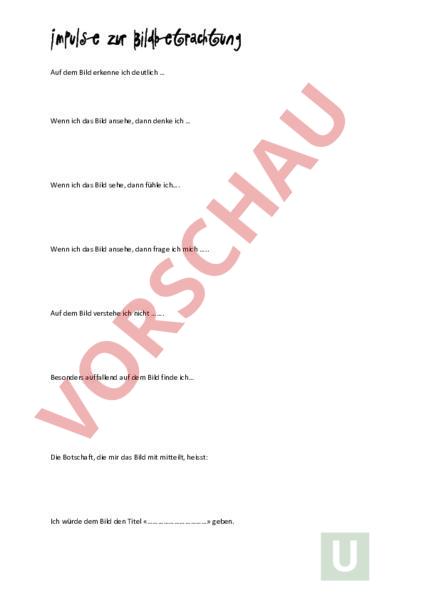 Impulse zur Bildbetrachtung Auf dem Bild erkenne ich deutlich Wenn ich das Bild ansehe, dann denke ich Wenn ich das Bild sehe, dann fühle ich. Wenn ich das Bild ansehe, dann frage ich mich Auf dem Bild verstehe ich nicht . Besonders auffallend auf dem Bild finde ich Die Botschaft, die mir das Bild mit mitteilt, heisst: Ich würde dem Bild den Titel «» geben.