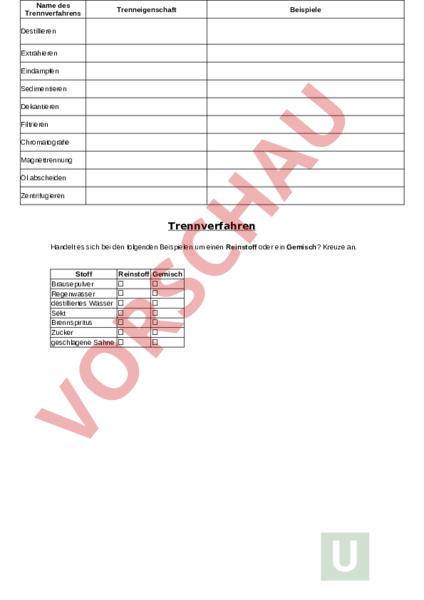 Name des Trennverfahrens Trenneigenschaft Beispiele Destillieren Extrahieren Eindampfen Sedimentieren Dekantieren Filtrieren Chromatografie Magnettrennung Öl abscheiden Zentrifugieren Trennverfahren Handelt es sich bei den folgenden Beispielen um einen Reinstoff oder ein Gemisch? Kreuze an. Stoff Brausepulver Regenwasser destilliertes Wasser Sekt Brennspiritus Zucker geschlagene Sahne Reinstoff Gemisch Handelt es sich bei den folgenden Gemischen um ein homogenes oder ein heterogenes Gemisch? Stoff Milch Rotwein Tinte Rauch homogen heterogen Stoff Lehmwasser Schaumstoff Mineralwasser Parfum homogen heterogen Welches Gemisch bildet sich beim Mischen der folgenden Stoffe mit Wasser? Stoff Wasser Zucker Wasser Salz Wasser Öl Wasser Essig Wasser Sand Wasser Alkohol Wasser Art des Gemischs Gib an, wie man folgende Gemische trennen kann. Gemisch Schwefelpulver, Eisenspäne Sand, Eisenspäne, Kochsalz Sand, Sägespäne, Kochsalz, Wasser Sand, Iod Trennverfahren genutzte Stoffeigenschaft Warum darf durch Öl und Benzin verunreinigtes Wasser einer Autowaschanlage nur gereinigt über einen Ölabscheider in die Kanalisation gelangen? Erkläre seine Arbeitsweise. Welche Verunreinigungen können auf diese Weise nicht abgetrennt werden? Auf den Etiketten mancher Fruchtsaftgetränke oder auch Medikamente steht: „Vor Gebrauch schütteln!. Erläutere. . Nenne zwei Stoffgemische, die sich durch Destillation trennen lassen. Nenne die Eigenschaft, die man bei der Destillation zur Trennung nutzt. Rotwein wird zum Sieden erhitzt. Notiere, welcher Stoff zuerst verdampft. Begründe deine Antwort in einem Satz. Erklär mithilfe von Bild, wie Trinkwasser aus Meerwasser gewonnen wird. Meerwasser verdampft durch die Sonne. Der Wasserdampf kondensiert am Glasdach und wird als Trinkwasser gesammelt. Die Salze bleiben im Meerwasser zurück.
