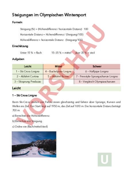 Steigungen im Olympischen Wintersport Formeln Steigung (%) (Höhendifferenz horizontale Distanz) · 100 Horizontale Distanz Höhendifferenz (Steigung/100) Höhendifferenz horizontale Distanz · (Steigung/100) Einschätzung Unter 15 flach 15–35 mittel über 35 steil Aufgaben Leicht Mittel Schwer 1 – Ski Cross Livigno 4 – Buckelpiste Livigno 6 – Halfpipe Livigno 2 – Abfahrt Cortina 5 – Abfahrt Bornio 7 Freestyle-Sprungschanze Livigno 3 – Skisprung Predazzo 8 – Vergleich Olympiaschanzen Leicht 1 – Ski Cross Livigno Beim Ski-Cross starten vier Fahrer:innen gleichzeitig und fahren über Sprünge, Kurven und Wellen ins Ziel. Der Start liegt auf 1950 m, das Ziel auf 1810 m. Die horizontale Distanz beträgt 700 a) Berechne die Höhendifferenz. b) Berechne die Steigung. c) Ordne ein (flach/mittel/steil) 2 – Abfahrt Cortina In der Abfahrt fahren Athleten und Athletinnen möglichst schnell eine lange Strecke hinunter mit Steilpassagen und Sprüngen. Die Olympia-Abfahrt auf der «Olimpia delle Tofane» beginnt auf 2320 und endet auf 1560 m. Die Strecke ist 2.8 km lang. a) Berechne die Höhendifferenz. b) Berechne die mittlere Steigung. c) Ordne ein (flach/mittel/steil). 3 – Skisprung Predazzo Beim Skispringen beschleunigt der Springer/die Springerin im Anlauf und springt möglichst weit über den Schanzentisch. Bei den Wettbewerben in Predazzo liegt der Start auf 1280 und die Landung auf 1150 m. Die horizontale Distanz beträgt 210 m. a) Berechne die Höhendifferenz. b) Berechne die Steigung. c) Ordne ein (flach/mittel/steil). Mittel 4 – Buckelpiste Livigno Beim Buckelpistenfahren springen Athleten über Hügel und steile Abschnitte und müssen dabei Sprünge und enge Kurven kontrollieren Abschnitt 1: 40 horizontal, 14 Höhenverlust Abschnitt 2: 60 horizontal, 18 Höhenverlust a) Berechne die Steigung beider Abschnitte. b) Welcher Abschnitt ist steiler? c) Berechne die durchschnittliche Steigung der ganzen Strecke. 5 – Abfahrt Bormio Eine Olympia-Abfahrt besteht aus drei Teilstücken: Abschnitt horizontale Länge Höhenverlust Startteil 300 180 Mittelteil 900 210 Zielhang 450 160 a) Berechne die Steigung jedes Abschnitts. b) Bestimme den steilsten Abschnitt. c) Berechne die durchschnittliche Steigung der gesamten Strecke. Schwer 6 – Halfpipe Livigno Die Halfpipe ist 160 lang. Der Start liegt auf 1920 m, das Pipe-Ende auf 1872 m. a) Berechne die Höhendifferenz. b) Berechne die mittlere Steigung. c) Wie lang wäre die horizontale Distanz bei 20 Steigung? 7 – Freestyle-Sprungschanze Livigno Eine Sprungschanze hat eine Steigung von 40 und eine horizontale Länge von 18 m. a) Berechne die Höhendifferenz. b) Wie hoch liegt der Absprung, wenn die Landung auf 1500 liegt? 8 – Vergleich Olympiaschanzen Schanze Ort Höhendifferenz Horizontale Predazzo Italien 130 210 Lillehammer Norwegen 125 200 Innsbruck Österreich 120 195 a) Berechne die Steigungen der drei Olympiaschanzen. b) Welche Schanze ist am steilsten? c) Wie viel Prozent steiler ist sie als die flachste? d) Berechne den prozentualen Durchschnitt der drei Steigungen.