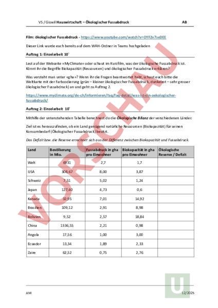 VS Giswil Hauswirtschaft – Ökologischer Fussabdruck AB Film: ökologischer Fussabdruck Dieser Link wurde euch bereits auf dem WAH-Ordner in Teams hochgeladen Auftrag 1: Einzelarbeit 10 Lest auf der Webseite «MyClimate» oder schaut im Kurzfilm, was der ökologische Fussabdruck ist. Könnt ihr die Begriffe Biokapazität (Ressourcen) und ökologischer Fussabdruck erklären? Was versteht man unter «gha»? Wenn ihr die Fragen beantwortet habt, schaut euch bitte die Weltkarte mit der Farbcodierung (grün – kleiner ökologisccher Fussabdruck, dunkelrot – sehr grosser ökologischer Fussabdruck) an und geht zu Auftrag 2. Auftrag 2: Einzelarbeit 10 Mithilfe der untenstehenden Tabelle berechnest du die Ökologische Bilanz der verschiedenen Länder. Ziel ist es herauszufinden, ob ein Land genügend natürliche Ressourcen (Biokapazität) für seinen Konsumbedarf (Ökologischer Fussabdruck) besitzt. Das Defizit bzw. die Reserve errechnet sich aus der Differenz zwischen Biokapazität und Fussabdruck. Land Bevölkerung in Mio. Fussabdruck in gha pro Einwohner Biokapazität in gha pro Einwohner Welt 6931 2,7 1,7 USA 308,67 8,00 3,87 7,51 5,02 1,24 Japan 127,40 4,73 0,6 Kanada 32,95 7,01 14,92 Brasilien 109,12 2,91 8,98 Bolivien 9,52 2,57 18,84 China 1336,55 2,21 0,98 Angola 17,56 1,00 3,00 Ecuador 13,34 1,89 2,33 Zaire 62,52 0,75 2,76 Schweiz AM Ökologische Reserve Defizit 12/2025 VS Giswil Hauswirtschaft – Ökologischer Fussabdruck AB Auftrag 3: Gruppenarbeit 3 oder 4 SS) 10 -15 Geht auf die Weltkarte des ökologischen Fussabdruckes auf «my climate». Welche Länder sind grün eingefärbt, haben also ein ökologisches Guthaben und welche sind rot oder dunkelrot eingefärbt und haben ein ökologisches Defizit. Besprecht was dies bedeuten könnte und beantwortet als Gruppe folgende Fragen: Was fällt euch auf, wenn ihr die Weltkarte betrachtet? Woran liegt es, dass bestimmte Lander ein ökologisches Defizit und andere ein ökologisches Guthaben haben? Welche Lander stechen heraus? Warum? Warum hat Zaire einen so kleinen Fussabdruck? Warum die USA einen so grossen ökologischen Fussabdruck? AM 12/2025
