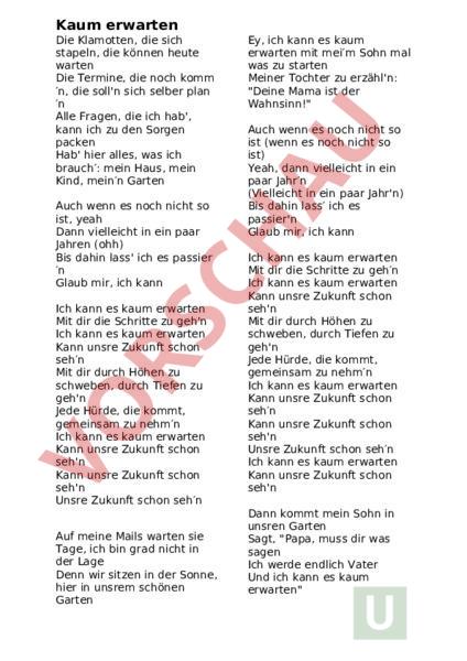 Kaum erwarten Die Klamotten, die sich stapeln, die können heute warten Die Termine, die noch komm ′n, die solln sich selber plan ′n Alle Fragen, die ich hab, kann ich zu den Sorgen packen Hab hier alles, was ich brauch′: mein Haus, mein Kind, mein′n Garten Auch wenn es noch nicht so ist, yeah Dann vielleicht in ein paar Jahren (ohh) Bis dahin lass ich es passier ′n Glaub mir, ich kann Ich kann es kaum erwarten Mit dir die Schritte zu gehn Ich kann es kaum erwarten Kann unsre Zukunft schon seh′n Mit dir durch Höhen zu schweben, durch Tiefen zu gehn Jede Hürde, die kommt, gemeinsam zu nehm′n Ich kann es kaum erwarten Kann unsre Zukunft schon sehn Kann unsre Zukunft schon sehn Unsre Zukunft schon seh′n Auf meine Mails warten sie Tage, ich bin grad nicht in der Lage Denn wir sitzen in der Sonne, hier in unsrem schönen Garten Ey, ich kann es kaum erwarten mit mei′m Sohn mal was zu starten Meiner Tochter zu erzähln: Deine Mama ist der Wahnsinn! Auch wenn es noch nicht so ist (wenn es noch nicht so ist) Yeah, dann vielleicht in ein paar Jahr′n (Vielleicht in ein paar Jahrn) Bis dahin lass′ ich es passiern Glaub mir, ich kann Ich kann es kaum erwarten Mit dir die Schritte zu geh′n Ich kann es kaum erwarten Kann unsre Zukunft schon sehn Mit dir durch Höhen zu schweben, durch Tiefen zu gehn Jede Hürde, die kommt, gemeinsam zu nehm′n Ich kann es kaum erwarten Kann unsre Zukunft schon seh′n Kann unsre Zukunft schon sehn Unsre Zukunft schon seh′n Ich kann es kaum erwarten Kann unsre Zukunft schon sehn Dann kommt mein Sohn in unsren Garten Sagt, Papa, muss dir was sagen Ich werde endlich Vater Und ich kann es kaum erwarten Ich kann es kaum erwarten (ich kann es kaum erwarten) Mit dir die Schritte zu geh′n (mit dir die Schritte zu gehn) Ich kann es kaum erwarten (kaum erwarten) Kann unsre Zukunft schon seh′n Mit dir durch Höhen zu schweben, durch Tiefen zu gehn Jede Hürde, die kommt, gemeinsam zu nehmn Ich kann es kaum erwarten (warten) Kann unsre Zukunft schon seh′n Kann unsre Zukunft schon seh′n Unsre Zukunft schon sehn Ich kann es kaum erwarten Kann unsre Zukunft schon seh′n Kann unsre Zukunft schon sehn Unsre Zukunft schon seh′n