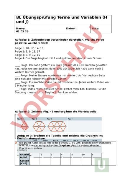 BL Übungsprüfung Terme und Variablen (H und J) Name: 01.03.26 Datum: Note: Aufgabe 1: Zahlenfolgen verschieden darstellen. Welche Folge passt zu welchem Text? Folge Folge Folge Folge 1: 2: 3: 4: 10, 12, 14, 16 5, 9, 13, 17 6, 9, 12, 15 Die Folge beginnt mit 3 und es kommen dann immer 5 dazu. Folge: Ich habe gestern ein Buch gekauft das 6.00 Franken gekostet hat. Jedes weitere Buch ist dann 50% günstiger. Ich habe dann noch 3 weitere Bücher gekauft. Folge: Meine Strasse wurde neu nummeriert. Auf der rechten Seite sind nun alle Häuser mit geraden Zahlen. Folge: Ein YouTube Video dauert drei Minuten. Jedes weitere Video war 5 Minuten lang. Folge: Jedes Paket, dass ich sende, kostet mich 4.00 Franken. Für die Sendung musste ich zu Beginn 1. Franken zahlen. Aufgabe 2: Zeichne Figur 5 und ergänze die Wertetabelle. Aufgabe 3: Ergänze die Tabelle und zeichne die Graphen ins Koordinatensystem. Ein grüner Apfel kostet neu in der Schweiz 1. 00 CHF. Ergänze die Wertetabelle und zeichne den entsprechenden Graphen blau ins untenstehende Koordinatensystem. Anzahl 1 Äpfel Kosten [CHF] 2 3 4 5 10 Man hat eine neue giftige Frucht entdeckt und die heisst Venomosa. Ein Biss kann tödlich sein. Auf dem Schwarzmarkt kostet ein Venomosa 12.00 CHF. Ergänze die Wertetabelle und zeichne den entsprechenden Graphen rot ins untenstehende Koordinatensystem. Anzahl Venom osa Kosten (CHF] 1 2 3 4 5 10 Kosten (CHF) Anzahl Äpfel Aufgabe 4: Variabel. Notiere unterhalb der Zeichnung die Buchstaben und notiere am Schluss den Term. Auf dem Zahlenstrahl unten wurden die Strecken a, und eingetragen. Notiere den entsprechenden Term. Term: Zeichne eine Strecke zum Term 2b a 2c. Aufgabe 5: Vereinfache die Terme. 8a 2a 2a b b – 2b 5a 3b – 3a – 2b 2c – 2a b b b – 2b 2b 3c – – 2c 2y 3z – – 2z 45g 55h 55g 55k 3 · 4a – 10a 4 · 5b – 2b 22 4a 13 2a 12a – (2a 3b) (3b – 3a) 5 – (x – 3y) – (1 – 2x – 3y) 14u 22v – (4u – 4v) – (9u 2v) (o – 12o) – (5o – 5j) Aufgabe 6: Löse die Zahlenpyramiden. 1 1 7 1 3 a a 2 1a 3c