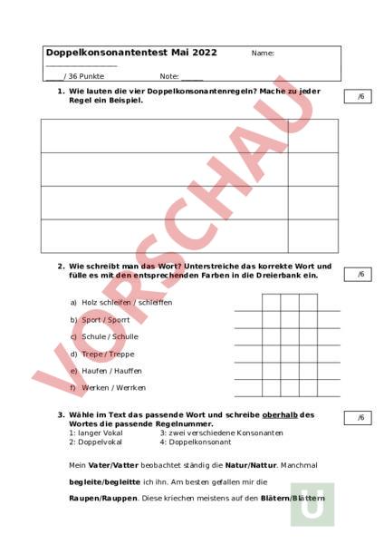 Doppelkonsonantentest Mai 2022 Name: / 36 Punkte Note: 1. Wie lauten die vier Doppelkonsonantenregeln? Mache zu jeder Regel ein Beispiel. /6 2. Wie schreibt man das Wort? Unterstreiche das korrekte Wort und fülle es mit den entsprechenden Farben in die Dreierbank ein. /6 a) Holz schleifen schleiffen b) Sport Sporrt c) Schule Schulle d) Trepe Treppe e) Haufen Hauffen f) Werken Werrken 3. Wähle im Text das passende Wort und schreibe oberhalb des Wortes die passende Regelnummer. 1: langer Vokal 3: zwei verschiedene Konsonanten 2: Doppelvokal 4: Doppelkonsonant Mein Vater/Vatter beobachtet ständig die Natur/Nattur. Manchmal begleite/begleitte ich ihn. Am besten gefallen mir die Raupen/Rauppen. Diese kriechen meistens auf den Blätern/Blättern /6 umher. Meistens nehmen wir ein Rucksack mit in den Wald/Walld. Wir esen/essen eine Wurst/Wurrst, ein Stück Käse/Kässe und als Getränk/ Getrännk nehmen wir Waser/Wasser mit. Das macht immer viel Spas/Spass.