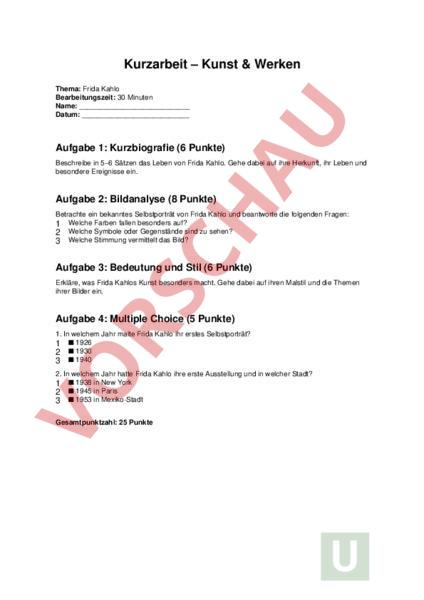Kurzarbeit – Kunst Werken Thema: Frida Kahlo Bearbeitungszeit: 30 Minuten Name: Datum: Aufgabe 1: Kurzbiografie (6 Punkte) Beschreibe in 5–6 Sätzen das Leben von Frida Kahlo. Gehe dabei auf ihre Herkunft, ihr Leben und besondere Ereignisse ein. Aufgabe 2: Bildanalyse (8 Punkte) Betrachte ein bekanntes Selbstporträt von Frida Kahlo und beantworte die folgenden Fragen: 1 Welche Farben fallen besonders auf? 2 Welche Symbole oder Gegenstände sind zu sehen? 3 Welche Stimmung vermittelt das Bild? Aufgabe 3: Bedeutung und Stil (6 Punkte) Erkläre, was Frida Kahlos Kunst besonders macht. Gehe dabei auf ihren Malstil und die Themen ihrer Bilder ein. Aufgabe 4: Multiple Choice (5 Punkte) 1. In welchem Jahr malte Frida Kahlo ihr erstes Selbstporträt? 1 1926 2 1930 3 1940 2. In welchem Jahr hatte Frida Kahlo ihre erste Ausstellung und in welcher Stadt? 1 1938 in New York 2 1945 in Paris 3 1953 in Mexiko-Stadt Gesamtpunktzahl: 25 Punkte