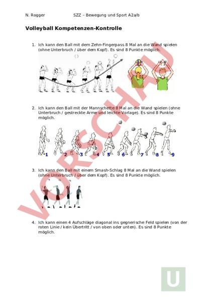 N. Rogger SZZ – Bewegung und Sport A2a/b Volleyball Kompetenzen-Kontrolle 1. Ich kann den Ball mit dem Zehn-Fingerpass 8 Mal an die Wand spielen (ohne Unterbruch über dem Kopf). Es sind 8 Punkte möglich. 2. Ich kann den Ball mit der Mannschette 8 Mal an die Wand spielen (ohne Unterbruch gestreckte Arme und leichte Vorlage). Es sind 8 Punkte möglich. 3. Ich kann den Ball mit einem Smash-Schlag 8 Mal an die Wand spielen (ohne Unterbruch über dem Kopf). Es sind 8 Punkte möglich. 4. Ich kann einen 4 Aufschläge diagonal ins gegnerische Feld spielen (von der roten Linie kein Übertritt von oben oder unten). Es sind 8 Punkte möglich. N. Rogger SZZ – Bewegung und Sport A2a/b 5. Ich kann 8 Bälle mit Zehn-Fingerpass oder Manschette über das Netz spielen (Ball wird von der gegnerischen Seite zugeworfen Ball muss von Gegner gut fangbar sein). Es sind 8 Punkte möglich. Total sind 40 Punkte möglich. Notenskala: 40 – 6.0 32 – 5.0 24 – 4.0 16 – 3.0 8 – 2.0