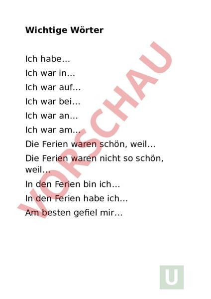 Wichtige Wörter Ich habe Ich war in Ich war auf Ich war bei Ich war an Ich war am Die Ferien waren schön, weil Die Ferien waren nicht so schön, weil In den Ferien bin ich In den Ferien habe ich Am besten gefiel mir
