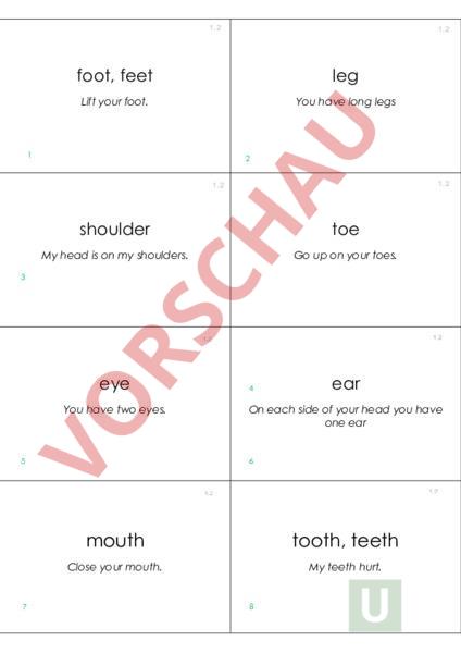 1.2 1.2 foot, feet leg Lift your foot. You have long legs 1 2 1.2 1.2 shoulder toe My head is on my shoulders. Go up on your toes. 3 eye You have two eyes. ear On each side of your head you have one ear 6 5 7 4 mouth tooth, teeth Close your mouth. My teeth hurt. 8 das Bein Fuss, Füsse Du hast lange Beine. Hebe deinen Fuss. der Zeh Steh auf deine Zehen. das Ohr die Schulter Mein Kopf ist auf meinen Schultern. das Auge Auf jeder Seite deines Kopfes hast du ein Ohr. Du hast zwei Augen Zahn, Zähne der Mund Meine Zähne schmerzen. Schliesse deinen Mund. bone body The neck bone is connected to the skull. Move your body! 10 9 Stand (up)! Lift your knee! Stand up please! Lift your knee high! 11 12 Shake your head! 13 15 Raise your hand! 14 Swing your arm! jump Swing your arm in big circle! always stretch before jump. 16 der Körper der Knochen Bewege deinen Körper! Der Nackenknochen ist mit dem Schädel verbunden. Hebe dein Knie Steh auf! Hebe dein Knie hoch! Steh bitte auf! Hebe deine Hand! Schüttle deinen Kopf! springen Schwinge deinen Arm! Ich dehne immer bevor ich springe. Schwinge deinen Arm in einem grossen Kreis. run long jump love to run. He practises the long jump every day. 17 18 strong weak have strong legs. He is not weak. 19 20 short tall He is short. am not tall 22 21 23 slow fast Sometimes am slow. like to ski fast. 24 der Weitsprung rennen Er übt jeden Tag weitspringen. Ich liebe es zu rennen. schwach stark Er ist nicht schwach. Ich habe starke Beine. gross klein Ich bin nicht gross. Er ist klein. schnell langsam Er liebt es, schnell Ski zu fahren. Manchmal bin ich langsam. running racket She loves running. For tennis you need racket. 25 26 helmet knee pads For cycling you need bicycle and helmet. 27 For cricket you need knee pads. 28 running shoes rowing boat like my new running shoes. For the regatta you need rowing boat. 30 29 bicycle cycling love my bicycle. 31 For cycling you need helmet. 32 der Schläger Für das Tennis brauchst du einen Schläger. die Knieschoner das Laufen Sie liebt es zu laufen. der Helm Für Cricket brauchst du Knieschoner. Für das Fahrradfahren brauchst du ein Fahrrad und einen Helm. das Ruderboot die Laufschuhe Für die Regatte brauchst du ein Ruderboot. Ich mag meine neuen Laufschuhe. das Fahrradfahren Für das Fahrradfahren brauchst du einen Helm. das Fahrrad Ich liebe mein Fahrrad. skiing What sport do you do? Skiing is winter sport. 33 34 How do you train? need (a). How do you train for your sport? 35 37 need helmet. 36 38 Was für einen Sport machst du? Skifahren ist ein Wintersport. Ich brauche (einen)? Wie trainierst du? Ich brauche einen Helm. das Skifahren Wie trainierst du für deinen Sport?