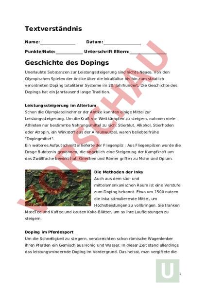 Textverständnis Name:_ Datum: Punkte/Note:_ Unterschrift Eltern: Geschichte des Dopings Unerlaubte Substanzen zur Leistungssteigerung sind nichts Neues. Von den Olympischen Spielen der Antike über die InkaKultur bis hin zum staatlich verordneten Doping totalitärer Systeme im 20. Jahrhundert. Die Geschichte des Dopings hat ein Jahrtausend lange Tradition. Leistungssteigerung im Altertum Schon die Olympiateilnehmer der Antike kannten einige Mittel zur Leistungssteigerung. Um die Kraft vor Wettkämpfen zu steigern, nahmen viele Athleten nur bestimmte Nahrungsmittel zu sich: Stierblut, Alkohol, Stierhoden oder Atropin, ein Wirkstoff aus der Alraunwurzel, waren beliebte frühe Dopingmittel. Ein weiteres Aufputschmittel lieferte der Fliegenpilz Aus Fliegenpilzen wurde die Droge Bufotenin gewonnen, die angeblich eine Steigerung der Kampfkraft um das Zwölffache bewirkt hat. Griechen und Römer griffen zu Mohn und Opium. Die Methoden der Inka Auch aus dem süd- und mittelamerikanischen Raum ist eine Vorstufe zum Doping bekannt. Etwa um 1500 nutzen die Inka stimulierende Mittel, um Höchstleistungen zu vollbringen. Sie tranken MateTee und Kaffee und kauten Koka-Blätter, um so ihre Laufleistungen zu steigern. Doping im Pferdesport Um die Schnelligkeit zu steigern, verabreichten schon römische Wagenlenker ihren Pferden ein Gemisch aus Honig und Wasser. In dieser Zeit stand allerdings das leistungsmindernde Doping im Vordergrund. Das heisst, man vergiftete die 1 Pferde, zum Beispiel mit Arsen und setzte sein Geld dann auf einen Konkurrenten. Da man die illegalen Substanzen aber noch nicht nachweisen konnte, wurde erst 1812 ein Dopingfall entdeckt – weil man den Täter auf frischer Tat ertappte. Erst mit den Fortschritten der pharmazeutischen Industrie gegen Ende des 19. Jahrhunderts wurde im Pferdesport das leistungssteigernde Doping ein Thema. 1910 wurde in Österreich erstmals das Doping bei Pferden nachgewiesen: Im Pferdespeichel wurden Spuren von Alkaloiden entdeckt. Durch seine konsequente Anwendung und Verbreitung hat Pferdedoping ebenso entscheidende wie zweifelhafte Schrittmacherdienste für das Doping beim menschlichen Sportler geleistet. Erste Dopingtote Bereits im 16. Jahrhundert erreichten die ersten koffeinhaltigen Drogen Europa und auch Kaffee gab es schon. Beweise für Doping im Sport finden sich jedoch erst in der zweiten Hälfte des 19. Jahrhunderts. Zu dieser Zeit war es bei Radrennfahrern fast schon normal, die Leistung durch die schnelle Pulle zwischendurch zu steigern. Der Begriff schnelle Pulle meint eine Trinkflasche, die dem Radrennfahrer von seinem Betreuer auf der Strecke gereicht wurde – und deren Inhalt mitunter aus geheimen Mischungen bestand. Manche Fahrer bevorzugten Mischungen auf Koffeinbasis, andere setzten auf einen Mix aus alkoholhaltigen Getränken – und insbesondere die Sprinter bauten auf Nitroglycerin. 1886 gab es den ersten Dopingtoten im Radsport: Beim Rennen Bordeaux-Paris starb der Engländer Linton an einer Überdosis Trimethyl. Der erste olympische Dopingtote wurde 1960 beklagt. Bei den Spielen in Rom fiel der Däne Knud Enemark Jensen vom Rad und starb. Wie sich im Nachhinein herausstellte, war er mit Amphetaminen gedopt. Der erste deutsche Sportler, der nachweislich an den Folgen von Doping starb, ist der Boxer Jupp Elze. Auch wenn er seine fatalen Gehirnverletzungen im Ring bei der Ausübung seines Berufes erlitt: Jupp Elze war kein Opfer des Boxens, sondern ein Opfer des Dopings. Am 12. Juni 1968 kämpfte Jupp Elze gegen Titelverteidiger Carlos Duran um die Europameisterschaft im Mittelgewicht. In der 15. und letzten Runde traf Duran Elze am Hinterkopf, der Deutsche sackte bewusstlos zusammen. Nach acht Tagen im Koma starb Elze an einer Gehirnblutung. Die Obduktion ergab, dass er 2 mit verschiedenen Substanzen gedopt war, darunter mit dem Aufputschmittel Pervitin. Ohne Dopingeinfluss hätte Elze aller Wahrscheinlichkeit vorzeitig wegen Erschöpfung aufgeben müssen – und hätte so zumindest diesen Kampf überlebt. So aber erlangte Jupp Elze traurige Berühmtheit: Er war der erste deutsche Sportler, der nachweislich an den Folgen von Doping starb. Doping in der ehemaligen DDR Zu verbotenen leistungssteigernden Mitteln wird in beinahe allen Staaten dieser Welt gegriffen, auch in der Schweiz oder Deutschland. Doch es handelt sich meist um individuelles Doping, für das der einzelne Sportler die Verantwortung trägt. Anders war das im Sportsystem der DDR. In keinem anderen Land wurde der Sport so eindeutig im politischen Sinne instrumentalisiert. Siege des Sports sind Siege des Sozialismus, war die Devise. Sportler waren Diplomaten in blauen Trainingsanzügen, die der ganzen Welt beweisen sollten, wie erfolgreich das sozialistische System funktionierte. Nur: Mit Talentförderung und speziellen Trainingsmethoden allein waren die gewünschten Siege nicht zu erreichen. Doch die DDR-Führung fand eine Lösung: Sie liessen das Anabolikum OralTurinabol als Dopingmittel zu. Nach Schätzungen wurden so in den 1970er und 1980er Jahren 10 00 Athleten mit männlichen Hormonen hochgezüchtet. Mindestens 800 gravierende Fälle gab es, die nicht selten mit dem Tod des Sportlers endeten. Beteiligt am Staatsdoping waren Ärzte, Funktionäre, Trainer – in allen Sportarten. DDR-Sportler waren in diesem Fall keine Dopingsünder, sondern Dopingopfer. Doping im Breitensport Sind diese Muskeln wirklich antrainiert? Heutzutage wird nicht nur bei den Profis im Spitzensport gedopt. Umfangreiche Studien belegen, dass auch im Breitensport Doping eine immer grössere Rolle spielt. Vor allem im Fitnessbereich und im Bodybuilding sind sogenannte NahrungsErgänzungsmittel wie Kreatin an der Tagesordnung. Aber auch Anabolika und Wachstumshormone kommen zum Einsatz. Mit ihnen werden die Muskeln noch grösser – mit Training allein lassen sich die überdimensionierten Muskelpakete eben kaum formen. Die Einnahme verbotener 3 Mittel im Freizeitsport fällt genau genommen al
