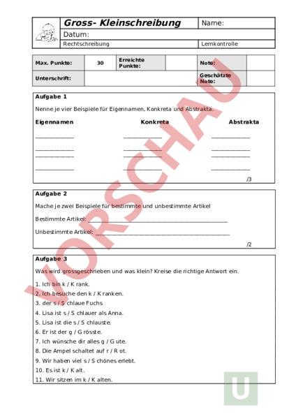 Gross- Kleinschreibung Name: Datum: Rechtschreibung Max. Punkte: 30 Lernkontrolle Erreichte Punkte: Note: Geschätzte Note: Unterschrift: Aufgabe 1 Nenne je vier Beispiele für Eigennamen, Konkreta und Abstrakta. Eigennamen Konkreta Abstrakta /3 Aufgabe 2 Mache je zwei Beispiele für bestimmte und unbestimmte Artikel Bestimmte Artikel: Unbestimmte Artikel: /2 Aufgabe 3 Was wird grossgeschrieben und was klein? Kreise die richtige Antwort ein. 1. Ich bin / rank. 2. Ich besuche den / ranken. 3. der / chlaue Fuchs 4. Lisa ist / chlauer als Anna. 5. Lisa ist die / chlauste. 6. Er ist der / rösste. 7. Ich wünsche dir alles / ute. 8. Die Ampel schaltet auf / ot. 9. Wir haben viel / chönes erlebt. 10. Es ist / alt. 11. Wir sitzen im / alten. Gross- Kleinschreibung Name: Datum: Rechtschreibung Lernkontrolle 12. Der Schnee ist / Weiss. /6 Aufgabe 4 Ordne die Bezeichnungen in die richtige Spalte. Bei welchen Begriffen werden die Adjektive gross- und bei welchen kleingeschrieben? DIE ENGADINER NUSSTORTE, DAS WALLISER RACLETTE, DAS IRISCHE TRIKOT, DAS OLYMPISCHE FEUER, DAS BASLER LECKERLI, DAS SCHOTTISCHE HOCHLAND, DAS SCHWARZE SCHAF, DIE ZÜRCHER SEIDE, DER SCHWEIZER KÄSE, DAS OLYMPISCHE FEUER Adjektive grossgeschrieben Adjektive kleingeschrieben /5 Aufgabe 5 Was wird grossgeschrieben und was klein? Kreise die richtige Antwort ein. 1. Ich / ese gerne. Beim / esen vergesse ich die Zeit. 2. Das / auchen ist ungesund, deshalb / auche ich nicht. 3. Ich habe mir beim / lettern den Fuss gebrochen. Jetzt darf ich sechs Wochen nicht / lettern. 4. Deutliches / prechen ist wichtig. Es können nicht alle deutlich / prechen. /4 Aufgabe 6 Schreibe einen Satz, in welchem das Verb «schlafen» als Nomen gebraucht wird. Gross- Kleinschreibung Name: Datum: Rechtschreibung Lernkontrolle Schreibe einen Satz, in welchem das Verb «lernen» einmal als Nomen und einmal als Verb gebraucht wird. /5 Aufgabe 7 Setze den korrekten Buchstaben ein. 1. Wir gehen orgen klettern. 2. Heute bend gibt es Pizza. 3. Ich muss orgens jeweils sehr früh aufstehen. 4. Ich habe orgen einen Deutschtest. 5. Ich habe heute orgen einen Deutschtest. 6. Wir wollen orgen früh an den See. 7. Heute bend gehen wir ins Kino. 8. Gestern bend war ich bei meiner Freundin. 9. Übermorgen achmittag habe ich frei. 10. Ich habe immer am ienstagabend Turnverein. /5 Gross- Kleinschreibung Name: Datum: Rechtschreibung Lernkontrolle