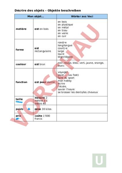 Décrire des objets – Objekte beschreiben Mon objet Wörter aus Voci est en bois en en en en en en forme est rectangulaire rond/-e long/longue court/-e large lourd léger/légère couleur est brun noir, rouge, bleu, vert, jaune, orange, blanc est pour dormir voyager jouer (au foot) faire du sport mon hobby écrire lécole, savoir lheure se brosser les dents/les cheveux matière fonction taille mesure 2 mètres à 1 mètre 40 poids pèse 30 kilos prix coûte 1 00 francs bois plastique métal tissu verre cuir