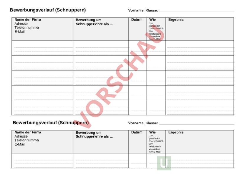 Bewerbungsverlauf (Schnuppern) Name der Firma Adresse Telefonnummer E-Mail Bewerbung um Schnupperlehre als Bewerbungsverlauf (Schnuppern) Name der Firma Adresse Telefonnummer E-Mail Bewerbung um Schnupperlehre als Vorname, Klasse: Datum Wie Ergebnis 1 persönlich 2 schriftlich 3 telefonisch 4 online 5 E-Mail Vorname, Klasse: Datum Wie 1 persönlich 2 schriftlich 3 telefonisch 4 online 5 E-Mail Ergebnis