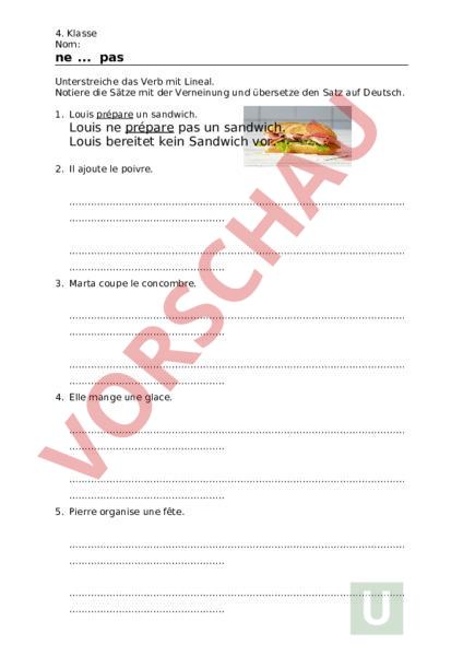 4. Klasse Nom: ne . pas Unterstreiche das Verb mit Lineal. Notiere die Sätze mit der Verneinung und übersetze den Satz auf Deutsch. 1. Louis prépare un sandwich. Louis ne prépare pas un sandwich. Louis bereitet kein Sandwich vor. 2. Il ajoute le poivre. 3. Marta coupe le concombre. 4. Elle mange une glace. 5. Pierre organise une fête. 4. Klasse Nom: 6. Il raconte une histoire. 7. Lilly invite la tante. 8. Elle cache le bonbon. 9. David joue au football. 10. Il lit un texte.