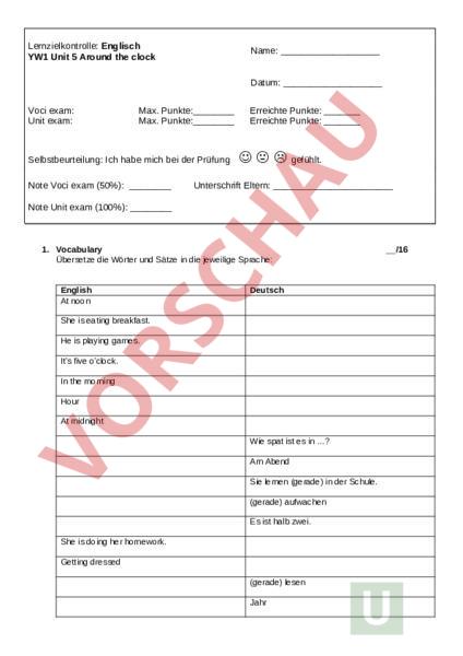 Lernzielkontrolle: Englisch YW1 Unit 5 Around the clock Name: Datum: Voci exam: Unit exam: Max. Punkte: Max. Punkte: Selbstbeurteilung: Ich habe mich bei der Prüfung Note Voci exam (50%): Erreichte Punkte: Erreichte Punkte: gefühlt. Unterschrift Eltern: Note Unit exam (100%): 1. Vocabulary Übersetze die Wörter und Sätze in die jeweilige Sprache: English At noon Deutsch She is eating breakfast. He is playing games. Its five oclock. In the morning Hour At midnight Wie spat ist es in ? Am Abend Sie lernen (gerade) in der Schule. (gerade) aufwachen Es ist halb zwei. She is doing her homework. Getting dressed (gerade) lesen Jahr /16 2. Write down sentence for every day of the week! Schreibe für jeden Wochentag einen Satz! On Monday Tuesday Wednesday Thursday Friday Saturday Sunday get up eat breakfast leave home eat lunch do my homework have dinner go to bed play an instrument take shower watch television read book play game do sports play outside /7 at one oclock. two three four five six seven eight nine ten eleven twelve half past quarter past quarter to Beispiel: On Saturday go to bed at 10 oclock. 3. Write the correct answer. Beantworte die Fragen. /5 a) How many weeks are in month? b) How many weeks are in year? c) How many minutes are in one hour? d) How many hours are in one day? e) How many days does February have in leap year? 4. Complete the sentences! Ergänze die Sätze! /4 This is Melina. She lives in. Melina is . This is Micha. He lives in . Micha is . 5. Draw and write the time. Zeichne und schreibe die Uhrzeit! /8 twenty past seven in the evening 08:35 am 11:30 pm quarter to four in the morning 6. Colour the three cards that go together with the same colour. Bemale immer drei passende Felder mit derselben Farbe. /4 He leaves home at 8 oclock. 7:45 He gets up at ten to seven. 08:00 He eats breakfast at quarter to eight. 6:50 He leaves school at quarter past 4pm. 16:15 7. Listen and connect! Zuhören und verbinden! Au ary Febru Oc Ju ly De No ary Ju Sep Janu cember Ma /6 ne Mar tember tober vember ch il Apr gust Viel Glück!