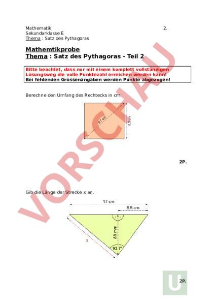 Mathematik Sekundarklasse Thema Satz des Pythagoras 2. Mathemtikprobe Thema Satz des Pythagoras Teil 2 Bitte beachtet, dass nur mit einem komplett vollständigen Lösungsweg die volle Punktezahl erreichen werden kann! Bei fehlenden Grössenangaben werden Punkte abgezogen! Berechne den Umfang des Rechtecks in cm. 2P. Gib die Länge der Strecke an. 2P. Das Verkehrszeichen 16 Steigung bedeutet, dass eine Straße auf 100m Länge um 16 Höhenmeter ansteigt. Wie lang ist eine Straße, die auf 100 um 16 ansteigt? Runde auf zwei Stellen nach dem Komma. 2P. An einer Feuerstelle befindet sich eine Astgabel, die sich in 1,05 Höhe verzweigt. Ein neuer Baumstamm wird darin befestigt, um als Grillgalgen zu dienen. Der Handwerker verankert 34 cm des Stammes in 2,08 Entfernung zur Astgabel im Boden. Dadurch sind die beiden durch die Gabel getrennten, sichtbaren Baumabschnitte (x) gleich groß. Welche länge hat der Baumstamm? Der neu eingesetzte Baumstamm istm lang. 4P. Trage die Länge der unteren Trapezseite ein. 4P. Pythagoras im Raum Berechne die Raumdiagonale 4P. Berechne die Strecke x. 4P. Berechne die violette Dreiecksfläche! Die Grössen sind in Meter m angegeben! 6P. Maximale Punktezahl Erreichte Punktezahl Note Klassenschnitt 28 Punkte Punkte