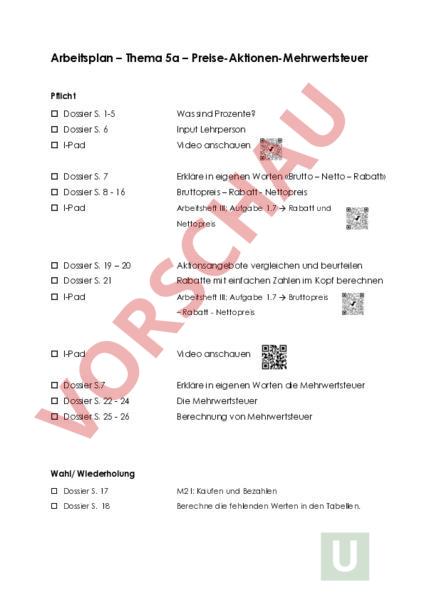 Arbeitsplan – Thema 5a – Preise-Aktionen-Mehrwertsteuer Pflicht Dossier S. 1-5 Was sind Prozente? Dossier S. 6 Input Lehrperson I-Pad Video anschauen Dossier S. 7 Erkläre in eigenen Worten «Brutto – Netto – Rabatt» Dossier S. 8 16 Bruttopreis – Rabatt Nettopreis I-Pad Arbeitsheft III; Aufgabe 1.7 à Rabatt und Nettopreis Dossier S. 19 – 20 Aktionsangebote vergleichen und beurteilen Dossier S. 21 Rabatte mit einfachen Zahlen im Kopf berechnen I-Pad Arbeitsheft III; Aufgabe 1.7 à Bruttopreis – Rabatt Nettopreis I-Pad Video anschauen Dossier S.7 Erkläre in eigenen Worten die Mehrwertsteuer Dossier S. 22 24 Die Mehrwertsteuer Dossier S. 25 26 Berechnung von Mehrwertsteuer Wahl/ Wiederholung Dossier S. 17 M2 I: Kaufen und Bezahlen Dossier S. 18 Berechne die fehlenden Werten in den Tabellen. Lernziele – Thema 5a – Preise-Aktionen-Mehrwertsteuer Lernziel 1: Ich kann an einem Beispiel die Bedeutung der Begriffe Bruttopreis, Nettopreis und Rabatt und Prozent erläutern. Üben: Dossier Seite 1 5 I-Pad Lernziel 2: Ich kann aus zwei der drei Angaben Bruttopreis, Nettopreis und Rabatt die dritte Angabe in Franken und in Prozent berechnen. Üben: Dossier Seite 6 – 18 I-Pad Arbeitsheft III; Aufgabe 1.7 à Rabatt und Nettopreis Arbeitsheft III; Aufgabe 1.7 à Bruttopreis – Rabatt Nettopreis Lernziel 3: Ich kann verschiedene Aktionsangebote vergleichen und beurteilen. Üben: Dossier Seite 19 20 Lernziel 4: Ich kann Rabatte mit einfachen Zahlen im Kopf berechnen. Üben: Dossier Seite 21 Lernziel 5: Bei einer Quittung den Mehrwertsteuersatz ablesen und die aufgeführten Berechnungen kontrollieren. Üben: Dossier Seite 22 – 24 I-Pad Lernziel 6: Ich kann den Mehrwertsteuerbetrag bei gegebenem MWST-Satz berechnen. Üben: Dossier Seite 25 26 www.meinunterricht.de -12bdc7cb391785c8c9e6c48bf423c626c www.meinunterricht.de -22bdc7cb391785c8c9e6c48bf423c626c www.meinunterricht.de -3- 2bdc7cb391785c8c9e6c48bf423c626c www.meinunterricht.de -4- 2bdc7cb391785c8c9e6c48bf423c626c www.meinunterricht.de Bruttopreis Rabatt in Prozent Rabatt in CHF -52bdc7cb391785c8c9e6c48bf423c626c kiick iKKKiBiKKrere Kaufen und Bezahlen: 5a Preise-Aktionen-Mehrwertsteuer ) Bruttopreis-Rabatt-Nettopreis Geschäfte werben mit Sonderverkäufen um Kundinnen und Kunden. Dabei wird bei Produkten der ursprüngliche Preis reduziert, Es wird ein Rabatt gewährt. 07 EinVelo kostete ursprünglich CHF 1200. Der Rabatt beträgt 20%. Nach Abzug des Rabatts kostet dasVelo noch CHF 960. Der Preis wurde also um CHF 240 reduziert. Notiere unter jedem Symbol die entsprechenden Werte in Schweizer Franken und in Prozent. Bruttopreis Rabatt Nettopreis C3 CHF CHF % CHF .% Arbeitsheft klick, Kapitel 5 Kaufen und Bezahlen: 5a Preise-Aktionen-Mehrwertsteuer -6- Erkläre in eigenen Worten «Brutto – Netto – Rabatt» Erkläre in eigenen Worten «Mehrwertsteuer» -7- Runden von Geldbeträgen Die Schweizer 5-Rappen-Münze ist die Münze mit dem kleinsten Wert. Damit Waren bar bezahlt werden können, muss der Preis manchmal auf 5 Rappen auf- oder abgerundet werden. Beispiele: CHF 3.72 CHF 3.70 CHF 3.724 CHF 3.70 CHF 3.73 CHF 3.75 CHF 3.725 CHF 3.75 CHF 3.77 CHF 3.75 CHF 3.774 CHF 3.75 CHF 3.78 CHF 3.80 CHF 3.775 CHF 3.80 Runde, falls nötig, bei allen Aufgaben die berechneten Preise auf 5 Rappen. Der Bruttopreis ist in Franken angegeben. Der Rabatt ist in Prozent angegeben. Übertrage die Angaben aus der Abbildung in die Tabelle. Berechne die fehlenden Werte und fülle dieTabelle aus. % f_ sn Rabatt Bruttopreis 1 Nettopreis CHF 150.00 Notiere deinen Rechenweg für den Rabatt in Franken: Nettopreis in Prozent: Nettopreis in Franken: Vergleicht zu zweit eure Rechenwege. 114 -8- Arbeitsheft klick, Kapitel 5 Kaufen und Bezahlen: 5a Preise-Aktionen-Mehrwertsteuer Bruttopreis 3Z Rabatt TT Nettopreis 3: CHF Notiere deinen Rechenweg für den Rabatt in Franken: Nettopreis in Prozent: Nettopreis in Franken: Vergleicht zu zweit eure Rechenwege. 3 Der Bruttopreis ist in Franken angegeben. Der Rabatt ist in Prozent angegeben. Übertrage die Angaben aus der Abbildung in die Tabelle. Berechne die fehlenden Werte und fülle die Tabelle aus. Runde den Nettopreis auf 5 Rappen. Bruttopreis f_ Rabatt CHF Arbeitsheft klick, Kapitel 5 Kaufen und Bezahlen: 5a Preise-Aktionen-Mehrwertsteuer -9- 115 Nettopreis fr o» (D 3. Ul :: ;.:; in !3! pin i3 co p- PJ J: ru U-i J: .-n 0-i -3 03 rn 3: C-i \ -i tn I.I-! £- 3:1 3 i— n. 3: Q-- ro £s e: r? 1-- 3 n 3 —t iT 0- c: nj ••£ co p- -T1 3: 0 -i 3 r- -l, ,-f- 3 i—t 1T -3 fst -I- u1 J: tTi -3 o-i ft lji ij-i •£1 Cs ! iE M* ,— ?3 0 3 3 i—: n it 0 ,—• 0 ••I; .70 i3 nj T 3 ,—• 0 ;—: 3- - 0 ss 3:i iSi ÜJ st 0- E-i es ?3 c: UJ in es iT \•*s -33 -i U! •s. :s:I o-i i3 I_ h_, Si ? ,-s- re 0 S.Q r: f 3n 7- 0 i—; ; 0 •T. Ut ps. x Ti 3:1 r- 0 -i —i i-n iTi p. •3 0 U-i -43 i3 •3 U:! 0i in —t- -? x- LD 3- Ul UJ i-l-i iTi 03 -5 .2 ,-r. -3 •£j ffi Q i33 j3 -3 ,-- rt- 0- tu •£i 3 E— W* M re —!- ltt .Q ? fv 3: 3:1 in UJ er.3 J-£ -i l C-i 03 2: 10 in Ii in Hyi3 ::.:: L •c :: •s •T. p- i— •r- -j 0 i3 co in ml 1-1 2: i -i Lli £ 3[ 0 a. :- —i t£ä iT —• Gl . i: UJ Ji u; ft E—t ••£. — n- -i3 IT. M. ;Ji 03 ro re Q- 0 •I; y. 0 Gehört zu Aufgabe 15 f 15 äW 75 Mehrwertsteuersätze Markiere bei den Kassehbelegen auf dem Arbeitsblatt die Angaben zur Mehrwertsteuer. — Übertrage die Werte von den Kassenbelegen in die Tabelle. Was fällt dir auf? 3 0 Arbeitsheft klick, Kapitel 5 Kaufen und Bezahlen: 5a Preise-Aktionen-Mehrwertsteuer 24 16 Bei dem Auszug aus der Rechnung fehlen dasTotal und der Betrag der Mehrwertsteuer. Rechnung Cool Center Welcher Mehrwertsteuersatz wird angewendet? 3 zus. Regale CHF 90.00 Kühlschrank 512 Liter A CHF 655.00 Total CHF MWST 7.7% CHF Berechne das Total, die Mehrwertsteuer und den Anteil des Cool Centers. Fülle die Tabelle aus. Runde auf 5 Rappen. MWST Anteil Cool Center 100 Total 1 CHF 17 77iBerechnung von Mehrwertsteuer und 