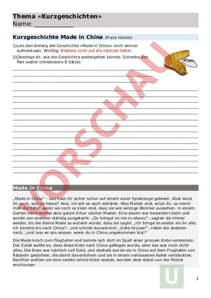 Thema «Kurzgeschichten» Name: Kurzgeschichte Made in China (Franz Hohler) 1)Lies den Anfang der Geschichte «Made in China» noch einmal aufmerksam. Wichtig: Blättere nicht auf die nächste Seite! 2)Überlege dir, wie die Geschichte weitergehen könnte. Schreibe den Text weiter (mindestens 8 Sätze). Made Made in China „Made in China – das habt ihr sicher schon auf einem eurer Spielzeuge gelesen. Aber wisst ihr auch, was es heisst? Also, ich will es euch erklären. Was Maden sind, wisst ihr, so nennt man die Käfer, wenn sie noch so klein sind, dass sie wie winzige Würmer aussehen. In einem Garten lebte einmal eine ganze Schar solcher Maden. Eine davon war besonders klein und wurde von anderen ständig ausgelacht. „Du bringst es nie zu etwas!, sagten sie immer wieder, bis die kleine Made so wütend wurde, dass sie sagte: „Ich bringe es weiter als ihr alle. Ich komme bis nach China!, und schnell davonkroch. „Viele Grüsse!, riefen die anderen nach, „und lass es uns wissen, wenn du in China angekommen bist! Die Made kroch zum Flughafen und konnte sich dort im Spalt einer grossen Kiste verstecken. Der Zufall wollte es, dass diese Kiste nach China geflogen wurde, aber das war noch nicht alles. Die Kiste war nämlich voll Gold, und deshalb wurde sie in China auf dem Flughafen von Räubern gestohlen, die damit davonfuhren und sie in einem verlassenen Keller versteckten. Nachher wollten sie eine zweite solche Kiste rauben, wurden aber dabei von der Polizei erschossen. 1 Jetzt wusste niemand mehr, wo die Kiste mit dem Gold war, ausser unserer Made. Die überlegte sich, wie sie ihren Maden zu Hause mitteilen konnte, dass sie in China angekommen war Dabei kam ihr in den Sinn, dass im Garten, wo sie lebten, ein grosser Sandhaufen war, in dem viele Kinder spielten. Deshalb kaufte sie mit ihrem Gold alle Spielzeugfabriken in ganz China und befahl sofort, dass man auf jedes Spielzeug, das nach Europa verkauft wurde, die Nachricht draufdrucken musste: „Made in China. Ich kann euch sagen, die Maden machten grosse Augen, als sich die Kinder im Sandhaufen laut vorlasen, was auf ihren Spielzeugen stand. „Habt ihr das gehört?, flüsterten die Maden einander zu, „die ist tatsächlich angekommen. Viele von ihnen versuchten daraufhin auch, die Reise zu machen, aber keiner gelang es: Die eine flog mit einer Pendeluhr nach Amsterdam, die andere versteckte sich in einem Sandwich und wurde unterwegs aufgegessen, und die meisten kamen nicht einmal bis zum Flughafen, weil sie ihn entweder nicht fanden oder vorher von einem Vogel aufgepickt wurden. Klein sein allein genügt eben nicht, es gehört auch noch etwas Glück dazu. 3)Lies den Text genau durch. Markiere mit einem Leuchtstift wichtige Stellen. 4)Beantworte die Fragen. a) Warum wurde die Made immer ausgelacht? b) Warum will die Made nach China? c) Wie kam die Made an viel Geld? d) Was hat die Made mit dem Geld gekauft? e) Wie erfahren die anderen Maden, dass die kleine Made in China ist? f) Welche Bedeutung hat der Ausdruck «Made in China» im Text? 2 g) Welche Bedeutung hat der Ausdruck «Made in China» im Alltag? Kurzgeschichte Germanys next Seekuh (Marlene Röder) 1) Lies den Text genau durch. Markiere mit einem Leuchtstift wichtige Stellen. 2) Beantworte die Fragen Germanys next Seekuh (vereinfacht) Telefonanruf 1 Frag nicht. Mein Liebesleben existiert nicht. Falls sich das je ändern sollte, bist du die Erste, die es erfährt. Sofort. Ich werde dich anrufen und am Telefon singen. Was mich am meisten nervt, sind meine Eltern. Sie verstehen nicht, warum ich mit fünfzehn noch nie ein Date hatte. Für sie ist das unbegreiflich. Eltern finden ihr eigenes Kind ja immer toll, die haben keine Wahl. Und ehrlich gesagt habe ich es wohl ihrer DNA zu verdanken, dass ich nie Topmodel werde. Allein der Gedanke daran, ich als Topmodel, würde die Hyänen aus meiner Klasse zum Kreischen bringen. Von denen habe ich dir doch erzählt. Diese Mädchen mit ihrem schrillen Lachen und ihren mageren Ärschen. Papa sagt immer, an mir sei wenigstens was dran. Je mehr Mareike, umso mehr zum Liebhaben. Er meint das lieb, das weiss ich. Aber ehrlich gesagt hat er keine Ahnung. Er versucht, mein Selbstvertrauen aufzubauen. Früher seien rundliche Frauen begehrt gewesen, sagt er. Anderes Schönheitsideal. Genau das habe ich auch gedacht: Ich lebe einfach im falschen Jahrhundert. Ich muss jetzt Schluss machen, bei uns gibt es gleich Lasagne. Ich rufe dich nächste Woche an. Telefonanruf 2 Heute hatten wir zum ersten Mal Schwimmen und es war die Hölle. Natürlich war Fabian auch da. Er war mein einziger Lichtblick. Du hättest sehen sollen, wie er sich am Beckenrand hochgezogen hat. Die Wassertropfen sind an ihm heruntergelaufen, wie in einer Duschwerbung. Kein Scheiss. Die Hyänen standen nur da und haben geglotzt. Ja, ich auch. Was denkst du denn. Aber ich habe sowieso keine Chance bei ihm. Ich glaube, er kennt nicht einmal meinen Namen. Fette Leute sind unsichtbar. Trotzdem darf man ja träumen. Das Schwimmen selbst war kein Problem. Aber dann sollten wir springen. Springen an sich macht mir keine Angst. Aber das Anstehen davor war schlimm. Die Oberhyäne hat mit ihrem neuen Bikini angegeben. Kleidergrösse fast nichts. Du hättest vielleicht mit einer Arschbacke reingepasst, ich höchstens als Taschentuch. Jeder musste einzeln nach vorne zum Sprungbrett und einen Kopfsprung machen. Herr Brenner hat die Sprünge bewertet. Die Reihe vor mir wurde immer kürzer. Meine Knie haben gezittert. Ich wusste: Gleich bin ich dran. Gleich fallen sie über mich her. Dann war ich ganz vorne. Augen zu und durch. Ich habe gespürt, dass alle mich anstarren. Jemand hinter mir hat gemurmelt: Wenn die springt, bleibt kein Wasser im Becken. Danach war diese angespannte Stille. Alle haben auf den Kommentar der Oberhyäne gewartet. Sie hat 3 extra so laut geflüstert, dass ich es hören musste: Germanys next Seekuh. Die anderen haben gekreischt vor Lachen. Ich glaube, die ganze K