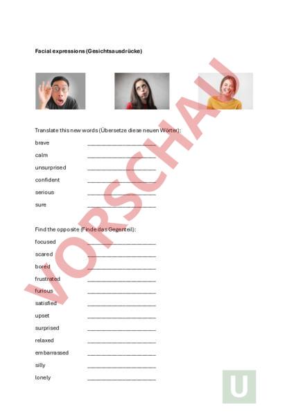 Facial expressions (Gesichtsausdrücke) Translate this new words (Übersetze diese neuen Wörter): brave calm unsurprised confident serious sure Find the opposite (Finde das Gegenteil): focused scared bored frustrated furious satisfied upset surprised relaxed embarrassed silly lonely confused disappointed distracted Translate this new words (Übersetze diese neuen Wörter): homework failed (to fail) because Complete the sentences (Vervollständige die Sätze): dont understand the homework. feel . failed my test. feel . can not focus in class because my friends are talking. feel . Write 5 sentences with diMerent facial expressions (Schreibe 5 Sätze mit verschiedenen Gesichtsausdrücken): Fill the right facial expressions in the gaps (Fülle die richtigen Gesichtsausdrücke in die Lücken): What does it mean (Was bedeutet): She has tears (Tränen) in her eyes. a) She is hungry. b) She is sad. c) She is proud. He is smiling. a) He is angry. b) He is scared. c) He is happy. She is frustrated. a) She is very happy. b) She is surprised. c) She is angry.