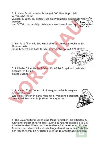 1) In einer Fabrik wurden bislang 4 000 Liter Öl pro Jahr verbraucht. Dafür wurden 2350.00 Fr. bezahlt. Da die Produktion gesteigert wird, werden nun 5 700 Liter benötigt. Wie viel muss bezahlt werden? 2) Ein Auto fährt mit 100 Km/h eine bestimmte Strecke in 30 Minuten. Wie lange braucht das Auto für die gleiche Strecke mit 120 Km/h? 3) Ich habe 3 identische Bücher für 63.90 Fr. gekauft. Wie viel bezahle ich für 22 dieser Bücher? 4) In einem Zug können mit 4 Waggons 480 Passagiere befördert werden. Wie viele Menschen kann man mit 5 Waggons befördern, wenn gleich viel Personen in je einem Waggon sind? 5) Die Bauarbeiter müssen eine Mauer erstellen, sie arbeiten zu fünft und brauchen für diese Mauer 3 ganze Arbeitstage à je 8.5 Arbeitsstunden. Wenn nun die Baufirma 2 Arbeiter mehr für das Erstellen der Mauer schickt, wie lange dauert dann das Erstellen der Mauer, wenn die Arbeiter gleich lange Arbeitstage machen? Name: Datum: