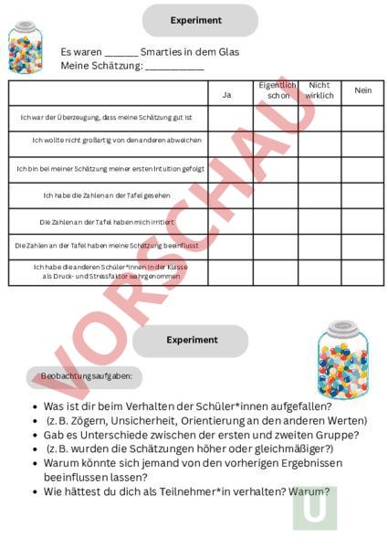 Experiment zum Thema Gruppenzwang, anschliessende Reflektion mit Hilfe des Arbeitsblatts. Experiment: Ein großes Glas/Vase wird gefüllt mit Bonbons etc. In meinem Glas befanden sich ca. 300 Bonbons. Die Klasse wird nun aufgeteilt in 10 SuS, die vor die Tür gehen, der Rest bleibt als Beobachter im Klassenzimmer. Ich sage den SuS, dass es sich um wichtiges wissenschaftliches Experiment handelt. Ich lasse die SuS einzeln hereinkommen und raten, wie viele Bonbons im Glas sind. Die Lösung schreibe ich für alle gut ersichtlich an die Tafel. Es werden Zahlenwerte zwischen 50 und 400 genannt. Irgendwann ergänze ich an der Tafel bei allen genannten Ergebnisse eine null. Die SuS, die danach den Raum betreten und schätzen sollen, lassen sich von den Zahlenwerten an der Tafel so beeinflussen, dass sie deutlich höhere Zahlenwerte nennen.