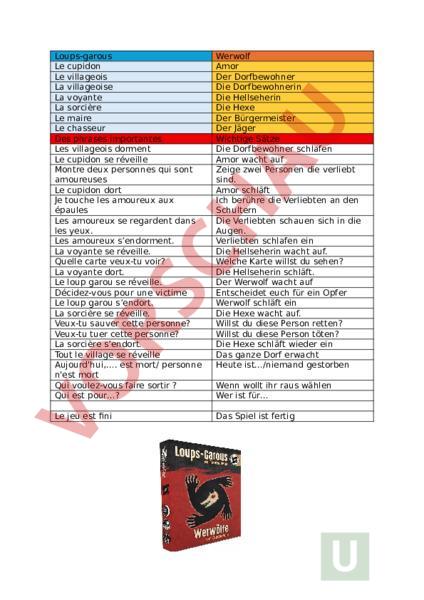Loups-garous Le cupidon Le villageois La villageoise La voyante La sorcière Le maire Le chasseur Des phrases importantes Les villageois dorment Le cupidon se réveille Montre deux personnes qui sont amoureuses Le cupidon dort Je touche les amoureux aux épaules Les amoureux se regardent dans les yeux. Les amoureux sendorment. La voyante se réveille. Quelle carte veux-tu voir? La voyante dort. Le loup garou se réveille. Décidez-vous pour une victime Le loup garou sendort. La sorcière se réveille. Veux-tu sauver cette personne? Veux-tu tuer cette personne? La sorcière sendort. Tout le village se réveille Aujourdhui,. est mort/ personne nest mort Qui voulez-vous faire sortir Qui est pour? Werwolf Amor Der Dorfbewohner Die Dorfbewohnerin Die Hellseherin Die Hexe Der Bürgermeister Der Jäger Wichtige Sätze Die Dorfbewohner schlafen Amor wacht auf Zeige zwei Personen die verliebt sind. Amor schläft Ich berühre die Verliebten an den Schultern Die Verliebten schauen sich in die Augen. Verliebten schlafen ein Die Hellseherin wacht auf. Welche Karte willst du sehen? Die Hellseherin schläft. Der Werwolf wacht auf Entscheidet euch für ein Opfer Werwolf schläft ein Die Hexe wacht auf. Willst du diese Person retten? Willst du diese Person töten? Die Hexe schläft wieder ein Das ganze Dorf erwacht Heute ist/niemand gestorben Le jeu est fini Das Spiel ist fertig Wenn wollt ihr raus wählen Wer ist für