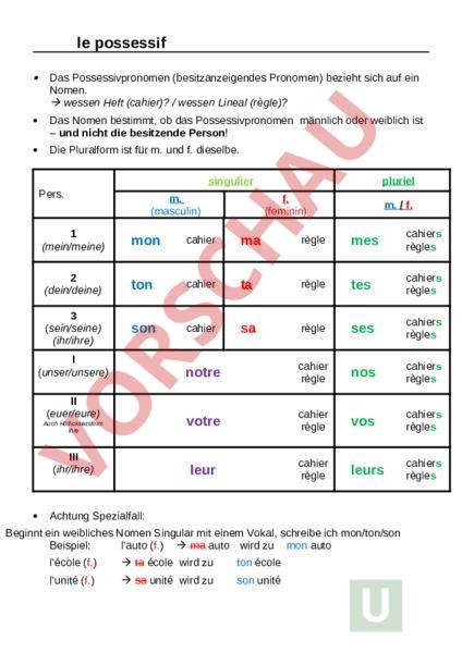 le possessif Das Possessivpronomen (besitzanzeigendes Pronomen) bezieht sich auf ein Nomen. wessen Heft (cahier)? wessen Lineal (règle)?wessen wessen Heft (cahier)? wessen Lineal (règle)?Heft wessen Heft (cahier)? wessen Lineal (règle)?(cahier)? wessen Heft (cahier)? wessen Lineal (règle)?/ wessen Heft (cahier)? wessen Lineal (règle)?wessen wessen Heft (cahier)? wessen Lineal (règle)?Lineal wessen Heft (cahier)? wessen Lineal (règle)?(règle)? Das Nomen bestimmt, ob das Possessivpronomen männlich oder weiblich ist – und nicht die besitzende Person! Die Pluralform ist für m. und f. dieselbe. singulier Pers. m. (masculin) f. (feminin) m. f. 1 (mein/meine) mon cahier ma règle mes cahiers règles 2 (dein/deine) ton cahier ta règle tes cahiers règles 3 (sein/seine) (ihr/ihre) son cahier sa règle ses cahiers règles notre cahier règle nos cahiers règles votre cahier règle vos cahiers règles leur cahier règle leurs cahiers règles (unser/unsere) II (euer/eure) Auch wessen Heft (cahier)? wessen Lineal (règle)?Höflickkeitsform Ihre wessen Heft (cahier)? wessen Lineal (règle)? III (ihr/ihre) pluriel Achtung Spezialfall: Beginnt ein weibliches Nomen Singular mit einem Vokal, schreibe ich mon/ton/son Beispiel: lauto (f.) ma auto wird zu mon auto lécole (f.) ta école wird zu ton école lunité (f.) sa unité wird zu son unité