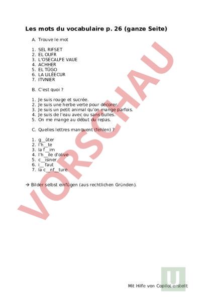 Les mots du vocabulaire p. 26 (ganze Seite) A. Trouve le mot 1. 2. 3. 4. 5. 6. 7. SEL RIFSET EL OUFR L‘OSECALPE VAUE ACHHER EL TÛGO LA LILÈECUR ITVNIER B. Cest quoi 1. 2. 3. 4. 5. Je suis rouge et sucrée. Je suis une herbe verte pour décorer. Je suis un petit animal quon mange parfois. Je suis de leau avec ou sans bulles. On me mange au début du repas. C. Quelles lettres manquent (fehlen) 1. 2. 3. 4. 5. 6. 7. gûter lhte la fim lhile dolive cisiner i faut la cnfture Bilder selbst einfügen (aus rechtlichen Gründen). Mit Hilfe von Copilot erstellt