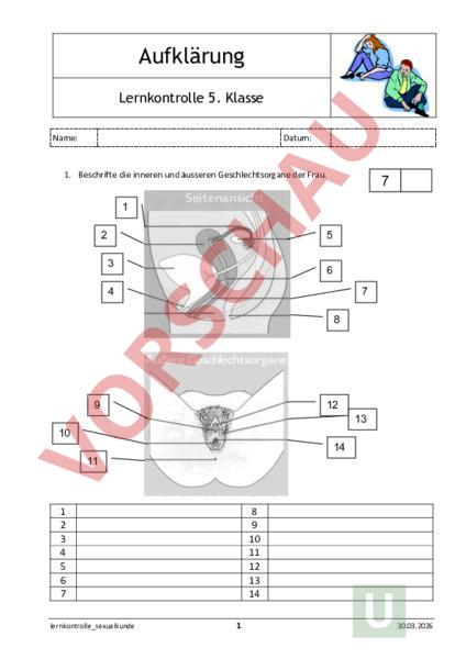 Aufklärung Lernkontrolle 5. Klasse Name: Datum: 1. Beschrifte die inneren und äusseren Geschlechtsorgane der Frau. 7 1 2 5 3 6 4 7 8 9 12 13 10 14 11 1 2 3 4 5 6 7 lernkontrolle_sexualkunde 8 9 10 11 12 13 14 1 30.03.2026 2. Beschrifte die inneren und äusseren Geschlechtsorgane des Mannes. 7 7 1 2 8 3 4 9 5 10 6 11 12 13 1 2 3 4 5 6 7 lernkontrolle_sexualkunde 14 8 9 10 11 12 13 14 2 30.03.2026 3. Nenne je drei Veränderungen, welche nur bei Mädchen auftreten. 3 4. Nenne je drei Veränderungen, welche nur bei Jungen auftreten. 3 lernkontrolle_sexualkunde 3 30.03.2026 5. Hygiene: Nenne bei den folgenden Problemzonen das Problem und die Lösung. 3 Haare: Haut: P:_ P: L:_ L: Schweiss: P: L:_ 6. Menstruation: Schreibe zu den Bildern die richtige Zahl der Phase. 2 Phase Phase 1: Bei der Menstruation wird der grösste Teil der Gebärmutterschleimhaut abgestossen. Sie dauert drei bis sieben Tage. Im Durchschnitt verlassen 80 bis 85 ml Flüssigkeit den Körper. Phase 2: Nach der Menstruation ist die Gebärmutterschleimhaut dünn und im Eierstock reift eine Eizelle heran. Phase 3: Nach dem Eisprung gelangt die Eizelle vom Eierstock über den Eileiter in die Gebärmutter. Phase 4: Die Gebärmutterschleimhaut verdickt sich, um eine befruchtete Eizelle aufnehmen zu können. Falls eine Befruchtung stattfindet, bleibt die Gebärmutterschleimhaut erhalten. Wird die Eizelle nicht befruchtet, kommt es zur Periode und der Zyklus beginnt von neuem. lernkontrolle_sexualkunde 4 30.03.2026 7. AIDS: Kreuze an, wo eine Ansteckung mit HIV möglich ist. 2 o o o o Zungenküsse und Kuscheln ungeschützter Geschlechtsverkehr Besuch von öffentlichen Toiletten, Saunas oder Hallenbäder gemeinsamer Gebrauch von Spritzen bei Drogenkonsum Insektenstiche oder Hundebisse Husten und Niesen beim Arzt oder Zahnarzt Befriedigung mit der Hand 8. Pubertät bei Mädchen: lernkontrolle_sexualkunde 5 5 30.03.2026 9. Pubertät bei Jungen: 5 6 lernkontrolle_sexualkunde 5.5 5 4.5 4 3.5 6 3 2.5 2 1.5 1 30.03.2026