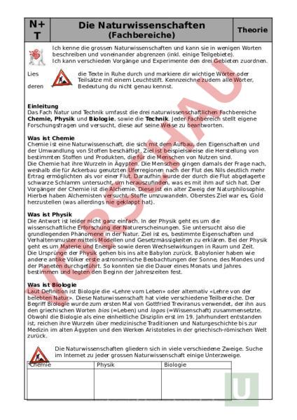 N Die Naturwissenschaften (Fachbereiche) Theorie Ich kenne die grossen Naturwissenschaften und kann sie in wenigen Worten beschreiben und voneinander abgrenzen (inkl. einige Teilgebiete). Ich kann verschieden Vorgänge und Experimente den drei Gebieten zuordnen. Lies deren die Texte in Ruhe durch und markiere dir wichtige Wörter oder Teilsätze mit einem Leuchtstift. Kennzeichne zudem alle Wörter, Bedeutung du nicht genau kennst. Einleitung Das Fach Natur und Technik umfasst die drei naturwissenschaftlichen Fachbereiche Chemie, Physik und Biologie, sowie die Technik. Jeder Fachbereich stellt eigene Forschungsfragen und versucht, diese auf seine Weise zu beantworten. Was ist Chemie Chemie ist eine Naturwissenschaft, die sich mit dem Aufbau, den Eigenschaften und der Umwandlung von Stoffen beschäftigt. Ziel ist beispielsweise die Herstellung von bestimmten Stoffen und Produkten, die für die Menschen von Nutzen sind. Die Chemie hat ihre Wurzeln in Ägypten. Die Menschen gingen damals der Frage nach, weshalb die für Ackerbau genutzten Uferregionen nach der Flut des Nils deutlich mehr Ertrag ermöglichten als vor einer Flut. Daraufhin wurde der durch die Flut abgelagerte schwarze Schlamm untersucht, um herauszufinden, was es mit ihm auf sich hat. Der Vorgänger der Chemie ist die Alchemie. Diese ist ein alter Zweig der Naturphilosophie. Hierbei haben Alchemisten versucht, Stoffe umzuwandeln. Oberstes Ziel war es, Gold herzustellen (was allerdings nie geklappt hat). Was ist Physik Die Antwort ist leider nicht ganz einfach. In der Physik geht es um die wissenschaftliche Erforschung der Naturerscheinungen. Sie untersucht also die grundlegenden Phänomene in der Natur. Ziel ist es, bestimmte Eigenschaften und Verhaltensmuster mittels Modellen und Gesetzmässigkeiten zu erklären. Bei der Physik geht es um Materie und Energie sowie deren Wechselwirkungen in Raum und Zeit. Die Ursprünge der Physik gehen bis ins alte Babylon zurück. Babylonier haben wie andere antike Völker erste astronomische Beobachtungen der Sonne, des Mondes und der Planeten durchgeführt. So konnten sie die Dauer eines Monats und Jahres bestimmen und legten den Beginn der Jahreszeiten fest. Was ist Biologie Laut Definition ist Biologie die «Lehre vom Leben» oder alternativ «Lehre von der belebten Natur». Diese Naturwissenschaft hat viele verschiedene Teilbereiche. Der Begriff Biologie wurde zum ersten Mal von Gottfried Treviranus verwendet, der ihn aus den griechischen Worten bios (Leben) und logos (Wissenschaft) zusammensetzte. Obwohl die Biologie als eine einheitliche Disziplin erst im 19. Jahrhundert entstanden ist, reichen ihre Wurzeln über medizinische Traditionen und Naturgeschichte bis zur Medizin im alten Ägypten und den Werken Aristoteles in der griechisch-römischen Welt zurück. Die Naturwissenschaften gliedern sich in viele verschiedene Zweige. Suche im Internet zu jeder grossen Naturwissenschaft einige Unterzweige. Chemie Physik Biologie N Die Naturwissenschaften (Fachbereiche) Aufgabe Gib jeweils eine Definition zu den drei Gebieten der Naturwissenschaften (wird in der Klasse zusammen erarbeitet). Chemie: Physik: Mit der Technik lassen sich die 3 Gebiete verbinden, erklären . Biologie: Die Lehrperson zeigt 3 einfache Experimente. Beschreibe die einzelnen Experimente kurz und versuche, jedes Experiment einer Naturwissenschaft zuzuordnen (Begründe mündl.). Zuordnung Experimentbeschrieb Versuche dich bei den folgenden Beispielen für ein Gebiet zu entscheiden (es können auch mehrere Fachbereiche möglich sein. Wichtig ist, dass du deine Wahl richtig begründen kannst). P Eisen rostet nach einer Zeit, wenn es mit Feuchtigkeit in Kontakt kommt. Strom fliesst in einem Kabel und die Lampe leuchtet. Das Herz schlägt schneller, wenn man sich körperlich betätigt. Ein Auto bewegt sich auf der Strasse vorwärts. Das Wachs einer Kerze schmilzt während hohen Temperaturen. An einem Lagerfeuer wird Brennholz verbrannt. Ein Baum, der von einem Samen heranwächst. Ein Magnet, der am Kühlschrank haftet. Die Haarfarbe wird beim Friseurbesuch gewechselt. Ein Kuchen wird gebacken. Für Schnelle: Suche 10 weitere Beispiele und schreibe diese auf ein weisses A5-Blatt. N Die Naturwissenschaften (Fachbereiche) Theorie Ich kenne die grossen Naturwissenschaften und kann sie in wenigen Worten beschreiben und voneinander abgrenzen. Ich kann verschieden Vorgänge und Experimente den drei Gebieten zuordnen. Lies deren die Texte in Ruhe durch und markiere dir wichtige Wörter oder Teilsätze mit einem Leuchtstift. Kennzeichne zudem alle Wörter, Bedeutung du nicht genau kennst. Einleitung Das Fach Natur und Technik umfasst die drei naturwissenschaftlichen Fachbereiche Chemie, Physik und Biologie, sowie die Technik. Jeder Fachbereich stellt eigene Forschungsfragen und versucht, diese auf seine Weise zu beantworten. Was ist Chemie Chemie ist eine Naturwissenschaft, die sich mit dem Aufbau, den Eigenschaften und der Umwandlung von Stoffen beschäftigt. Ziel ist beispielsweise die Herstellung von bestimmten Stoffen und Produkten, die für die Menschen von Nutzen sind. Die Chemie hat ihre Wurzeln in Ägypten. Die Menschen gingen damals der Frage nach, weshalb die für Ackerbau genutzten Uferregionen nach der Flut des Nils deutlich mehr Ertrag ermöglichten als vor einer Flut. Daraufhin wurde der durch die Flut abgelagerte schwarze Schlamm untersucht, um herauszufinden, was es mit ihm auf sich hat. Der Vorgänger der Chemie ist die Alchemie. Diese ist ein alter Zweig der Naturphilosophie. Hierbei haben Alchemisten versucht, Stoffe umzuwandeln. Oberstes Ziel war es, Gold herzustellen (was allerdings nie geklappt hat). Was ist Physik Die Antwort ist leider nicht ganz einfach. In der Physik geht es um die wissenschaftliche Erforschung der Naturerscheinungen. Sie untersucht also die grundlegenden Phänomene in der Natur. Ziel ist es, bestimmte Eigenschaften und Verhaltensmuster mittels Modellen und Gesetzmässigkeiten zu erklären. B