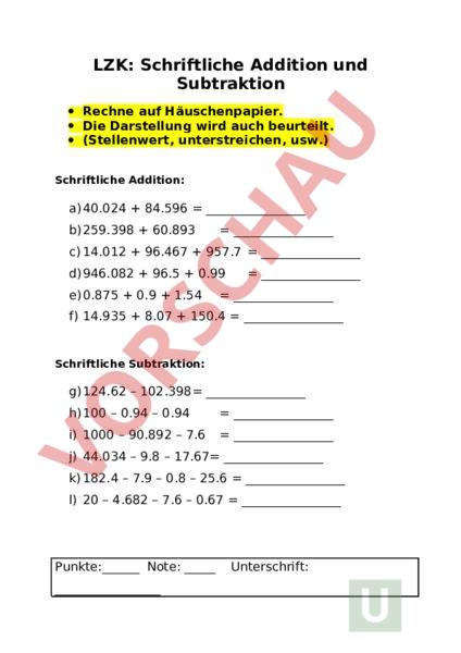 LZK: Schriftliche Addition und Subtraktion Rechne auf Häuschenpapier. Die Darstellung wird auch beurteilt. (Stellenwert, unterstreichen, usw.) Schriftliche Addition: a) 40.024 84.596 b)259.398 60.893 c) 14.012 96.467 957.7 d)946.082 96.5 0.99 e) 0.875 0.9 1.54 f) 14.935 8.07 150.4 Schriftliche Subtraktion: g)124.62 – 102.398 h) 100 – 0.94 – 0.94 i) 1000 – 90.892 – 7.6 j) 44.034 – 9.8 – 17.67 k) 182.4 – 7.9 – 0.8 – 25.6 l) 20 – 4.682 – 7.6 – 0.67 Punkte: Note: Unterschrift: