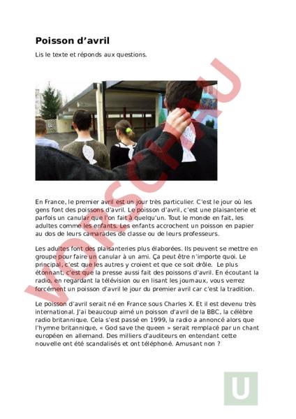 Poisson davril Lis le texte et réponds aux questions. En France, le premier avril est un jour très particulier. Cest le jour où les gens font des poissons davril. Le poisson davril, cest une plaisanterie et parfois un canular que lon fait à quelquun. Tout le monde en fait, les adultes comme les enfants. Les enfants accrochent un poisson en papier au dos de leurs camarades de classe ou de leurs professeurs. Les adultes font des plaisanteries plus élaborées. Ils peuvent se mettre en groupe pour faire un canular à un ami. Ça peut être nimporte quoi. Le principal, cest que les autres croient et que ce soit drôle. Le plus étonnant, cest que la presse aussi fait des poissons davril. En écoutant la radio, en regardant la télévision ou en lisant les journaux, vous verrez forcément un poisson davril le jour du premier avril car cest la tradition. Le poisson davril serait né en France sous Charles X. Et il est devenu très international. Jai beaucoup aimé un poisson davril de la BBC, la célèbre radio britannique. Cela sest passé en 1999, la radio annoncé alors que lhymne britannique, « God save the queen » serait remplacé par un chant européen en allemand. Des milliers dauditeurs en entendant cette nouvelle ont été scandalisés et ont téléphoné. Amusant non 1. Quel jour célèbre-t-on le poisson davril en France 2. Quest-ce quun poisson davril 3. Que font les enfants pour faire un poisson davril 4. Comment les adultes font-ils des poissons davril 5. Qui dautre fait des poissons davril en plus des adultes et des enfants 6. Où peut-on voir ou entendre des poissons davril dans les médias 7. Sous quel roi le poisson davril serait-il né en France 8. Quel exemple de poisson davril de la BBC est mentionné dans le texte 9. Quelle été la réaction des auditeurs après lannonce de la BBC 10. Pourquoi un poisson davril est-il réussi Un peu dhistoire Tradition du 1er avril en France