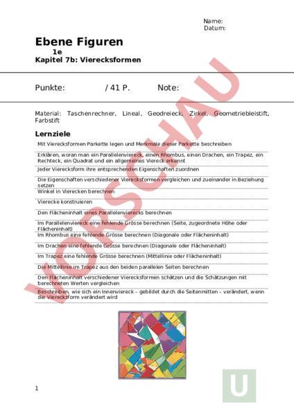 Name: Datum: Ebene Figuren 1e Kapitel 7b: Vierecksformen Punkte: Material: Farbstift 41 P. Taschenrechner, Note: Lineal, Geodreieck, Zirkel, Geometriebleistift, Lernziele Mit Vierecksformen Parkette legen und Merkmale dieser Parkette beschreiben Erklären, woran man ein Parallelenviereck, einen Rhombus, einen Drachen, ein Trapez, ein Rechteck, ein Quadrat und ein allgemeines Viereck erkennt Jeder Vierecksform ihre entsprechenden Eigenschaften zuordnen Die Eigenschaften verschiedener Vierecksformen vergleichen und zueinander in Beziehung setzen Winkel in Vierecken berechnen Vierecke konstruieren Den Flächeninhalt eines Parallelenvierecks berechnen Im Parallelenviereck eine fehlende Grösse berechnen (Seite, zugeordnete Höhe oder Flächeninhalt) Im Rhombus eine fehlende Grösse berechnen (Diagonale oder Flächeninhalt) Im Drachen eine fehlende Grösse berechnen (Diagonale oder Flächeninhalt) Im Trapez eine fehlende Grösse berechnen (Mittellinie oder Flächeninhalt) Die Mittellinie im Trapez aus den beiden parallelen Seiten berechnen Den Flächeninhalt verschiedener Vierecksformen schätzen und die Schätzungen mit berechneten Werten vergleichen Beschreiben, wie sich ein Innenviereck – gebildet durch die Seitenmitten – verändert, wenn die Vierecksform verändert wird 1 7b Vierecksformen Aufgabe 1 Berechne den Flächeninhalt und den Umfang der Figur. 4 P. Aufgabe 2 Für welche Vierecke gelten die folgenden Aussagen immer? Kreuze die richtigen Lösungen in der Tabelle an. (Parallelogramm Parallelenviereck) Rhombus 6 P. 2 V. Keller 7b Vierecksformen Aufgabe 3 Berechne den Winkel Delta . (Nicht messen!) 90 3 P. Aufgabe 4 a) Skizziere vier unterschiedliche Parallelogramme mit gleichem Umfang 24 cm. Beschrifte die Seiten mit und b. b) Zeichne jeweils die Höhe ha ein und berechne den Flächeninhalt. A A A A c) Wann ist der Flächeninhalt bei gleichem Umfang am grössten, wann wird er sehr klein? Beschreibe deine Beobachtung. 9 P. 3 V. Keller 7b Vierecksformen Aufgabe 5 Berechne die fehlenden Grössen 22.5 cm 21.6 cm 27 cm e? 17 dm 8 dm A? 12 cm ha 6 cm hb 8 cm a? 18 dm 12 dm 120 dm2 c? 21 b5m u? 10 P. 4 V. Keller 7b Vierecksformen Aufgabe 6 Konstruiere die Vierecke mit folgenden Angaben. a) Parallelenviereck 6 cm, 3,5 cm, 45 b) Trapez 6,5 cm, 2,2 cm, 35, 65 c) Drachen 3 cm, 7,2 cm, 4 cm 9 P. 5 V. Keller
