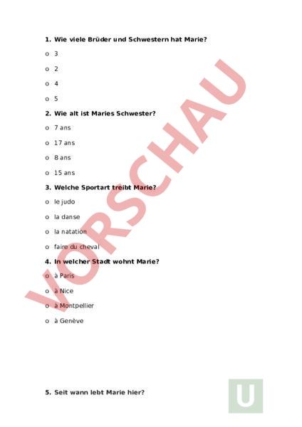 1. Wie viele Brüder und Schwestern hat Marie? 3 2 4 5 2. Wie alt ist Maries Schwester? 7 ans 17 ans 8 ans 15 ans 3. Welche Sportart treibt Marie? le judo la danse la natation faire du cheval 4. In welcher Stadt wohnt Marie? à Paris à Nice à Montpellier à Genève 5. Seit wann lebt Marie hier? depuis (Seit) 15 ans depuis 7 ans depuis 1 an depuis 3 ans 6. Welche Sportart mag Marie am liebsten? léquitation (faire du cheval) la danse le judo la natation
