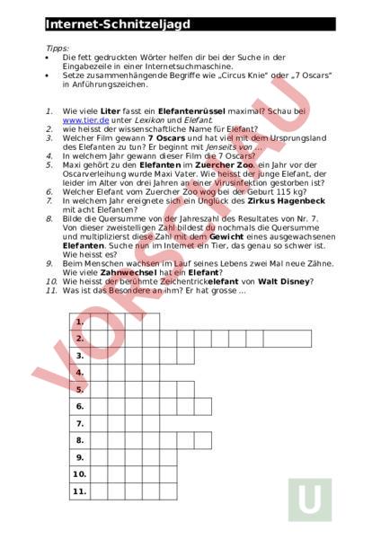 Internet-Schnitzeljagd Tipps: Die fett gedruckten Wörter helfen dir bei der Suche in der Eingabezeile in einer Internetsuchmaschine. Setze zusammenhängende Begriffe wie „Circus Knie oder „7 Oscars in Anführungszeichen. 1. Wie viele Liter fasst ein Elefantenrüssel maximal? Schau bei www.tier.de unter Lexikon und Elefant. 2. wie heisst der wissenschaftliche Name für Elefant? 3. Welcher Film gewann 7 Oscars und hat viel mit dem Ursprungsland des Elefanten zu tun? Er beginnt mit Jenseits von 4. In welchem Jahr gewann dieser Film die 7 Oscars? 5. Maxi gehört zu den Elefanten im Zuercher Zoo. ein Jahr vor der Oscarverleihung wurde Maxi Vater. Wie heisst der junge Elefant, der leider im Alter von drei Jahren an einer Virusinfektion gestorben ist? 6. Welcher Elefant vom Zuercher Zoo wog bei der Geburt 115 kg? 7. In welchem Jahr ereignete sich ein Unglück des Zirkus Hagenbeck mit acht Elefanten? 8. Bilde die Quersumme von der Jahreszahl des Resultates von Nr. 7. Von dieser zweistelligen Zahl bildest du nochmals die Quersumme und multiplizierst diese Zahl mit dem Gewicht eines ausgewachsenen Elefanten. Suche nun im Internet ein Tier, das genau so schwer ist. Wie heisst es? 9. Beim Menschen wachsen im Lauf seines Lebens zwei Mal neue Zähne. Wie viele Zahnwechsel hat ein Elefant? 10. Wie heisst der berühmte Zeichentrickelefant von Walt Disney? 11. Was ist das Besondere an ihm? Er hat grosse 1. 2. 3. 4. 5. 6. 7. 8. 9. 10. 11.
