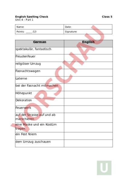 English Spelling Check Unit 4 – Part 1 Class 5 Name: Date: Points: /13 Signature: German spektakulär, fantastisch Freudenfeuer religiöser Umzug Fasnachtswagen Laterne bei der Fasnacht mitmachen Höhepunkt Dekoration Feuerwerk auf der Strasse auf und ab marschieren eine Maske und ein Kostüm tragen ein Fest feiern dem Umzug zuschauen English