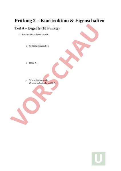 Prüfung 2 – Konstruktion Eigenschaften Teil – Begriffe (10 Punkte) 1. Beschrifte ein Dreieck mit: Seitenhalbierende sa Höhe a Winkelhalbierende (Skizze erforderlich) (10P) Teil – Konstruktion (20 Punkte) 2. Konstruiere ein Dreieck mit: Seite 6 cm Winkel 50 Winkel 60 (6P) 3. Konstruiere die Seitenhalbierenden und bestimme den Schwerpunkt. (5P) 4. Konstruiere die Ankreise (nur skizzieren reicht) (4P) 5. Konstruiere eine Winkelhalbierende und erkläre ihre Bedeutung. (5P) Teil – Denken (10 Punkte) 6. Der Schwerpunkt teilt jede Seitenhalbierende im Verhältnis 2:1. Zeichne und erkläre dies. (5P) 7. Warum kann ein Dreieck mehrere Lösungen haben? (Konstruktion) (5P)